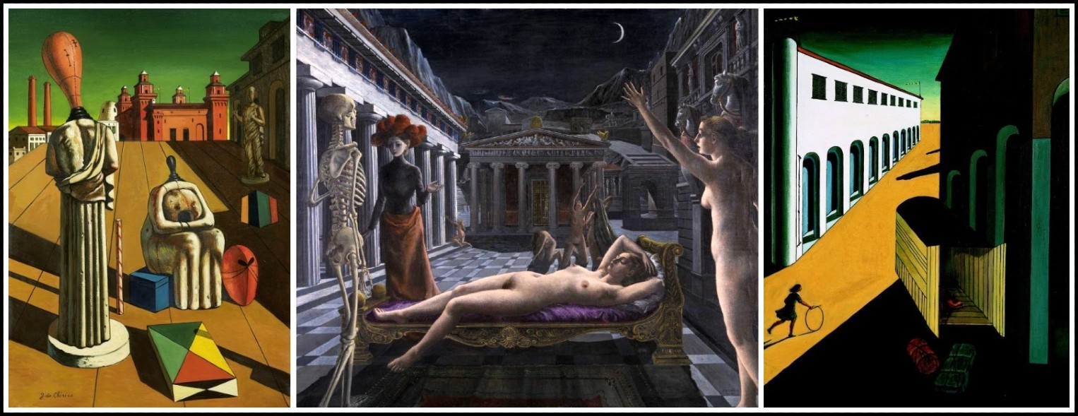Giorgio de Chirico, The Disquieting Muses, 1960 | Paul Delvaux, Sleeping Venus, 1944 | Giorgio de Chirico, Mystery and Melancholy of a Street (1948/1965)