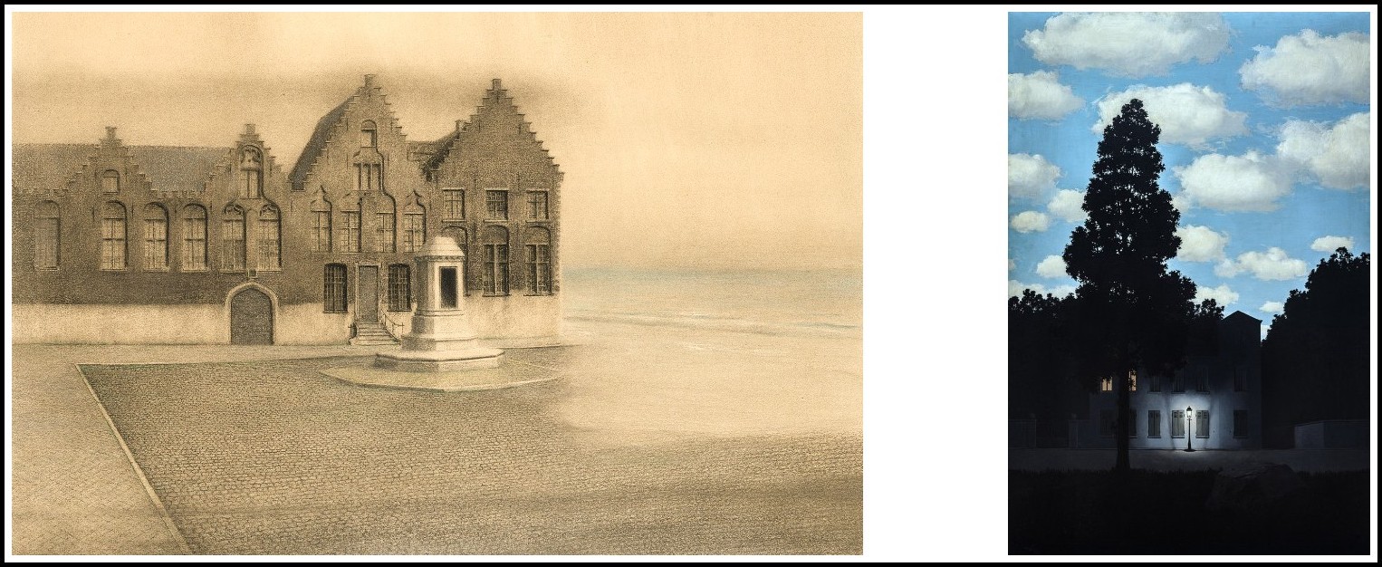 Fernand Khnopff, The Derelict City, 1904 (detail) | René Magritte The Empire of Light, 1954