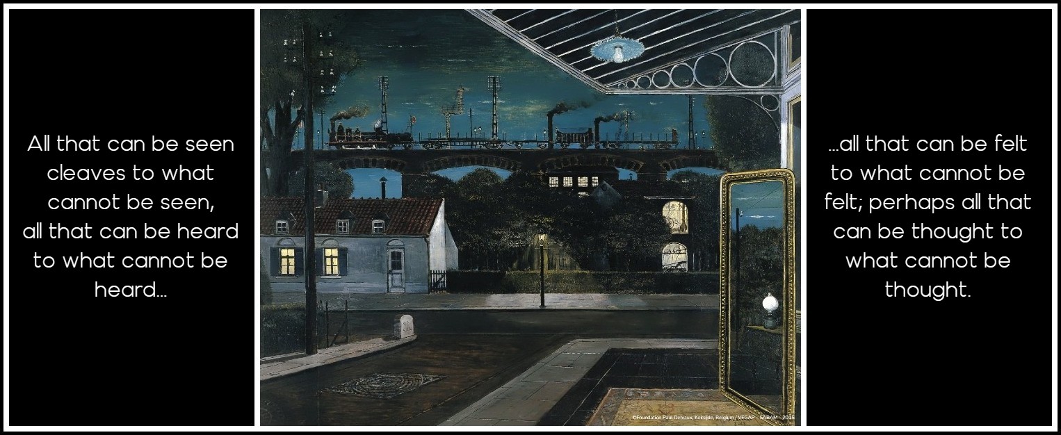 The mystery of Magritte, the mystery of Delvaux, the mystery of Khnopff, the mystery of Degouve de Nuncques and Spilliaert—each one a crystal ball transfiguring poetry, each one revealing that, as Novalis wrote, ‘all that can be seen cleaves to what cannot be seen, all that can be heard to what cannot be heard, all that can be felt to what cannot be felt; perhaps all that can be thought to what cannot be thought,’ each one stimulating our minds and senses with a desire to live poetry, passionately to immerse ourselves in it in order ultimately to fecundate life with the wild seed of seeing.