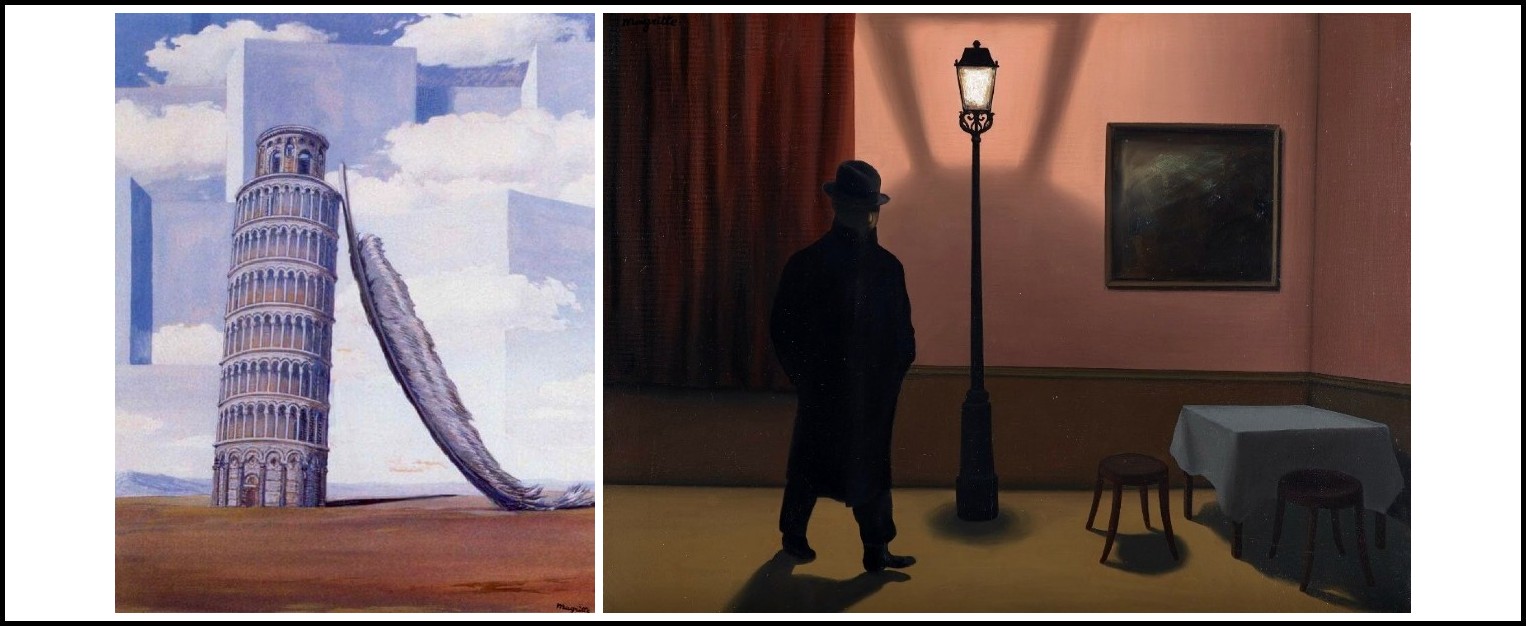 At other times Magritte experimented with modifications of the relative proportions of things, painting a feather and the Leaning Tower of Pisa the same size, or he turned appearances inside-out, putting a streetlamp in the middle of a room.