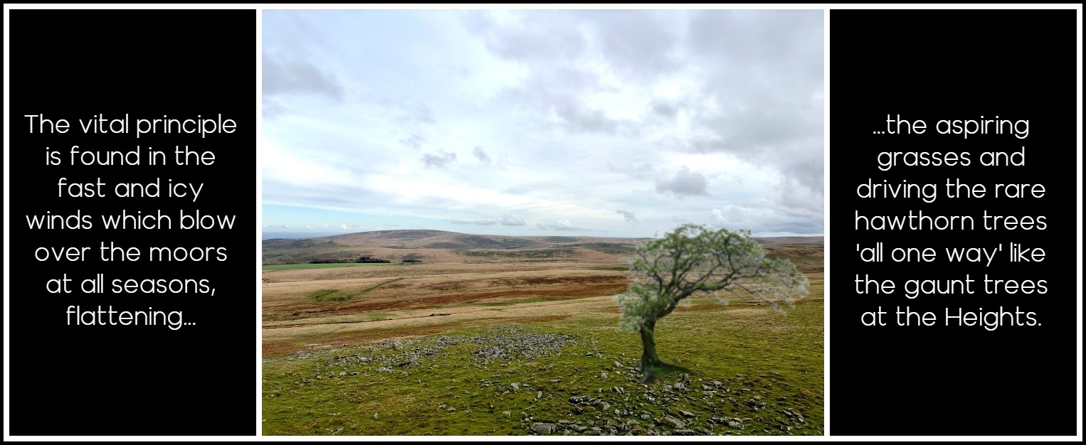 Emily hates the letter and loves the spirit; is almost physically sickened by forms and formalities, both socially and in religious matters, driving always toward the vital, organic life of ideas. In Emily’s blade of grass the ‘quivering’ motion tells of a vital principle which she can feel on her own skin, intuit from the trembling responsiveness of nature’s most modest productions. It clothes itself in the massive shapes of the hill-sides shouldering up against the sky, their backs turned on human, civic or social concerns. Equally, it clothes itself in the vesture of a tuft of grass, transiently illumined, and of no account in itself. It is found in the fast and icy winds which flow over the moors at all seasons, flattening the aspiring grasses and driving the rare hawthorn trees ‘all one way’ like the gaunt trees at the Heights. It is found in the impulses, passions and fantasies which appear in the mind of the observer of all this excited life, and overflow into a verse which contains and ‘curbs’ the will of the imaginings. The gentle tremor in the grass-leaf belongs to this process of response, self-assertion and the testing out of forms of being against a situation that is elementally open.