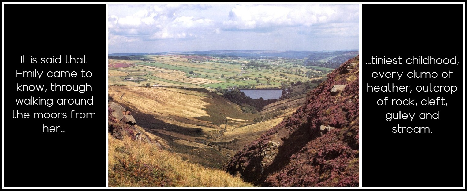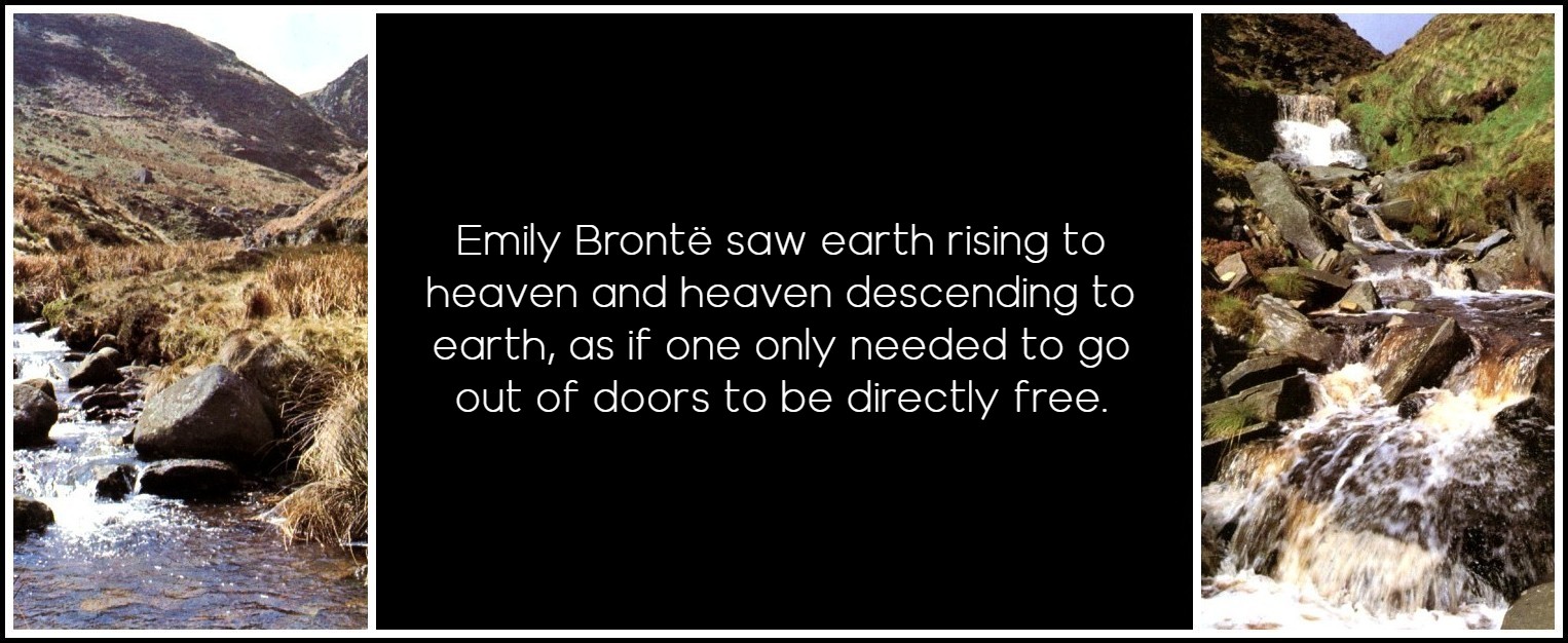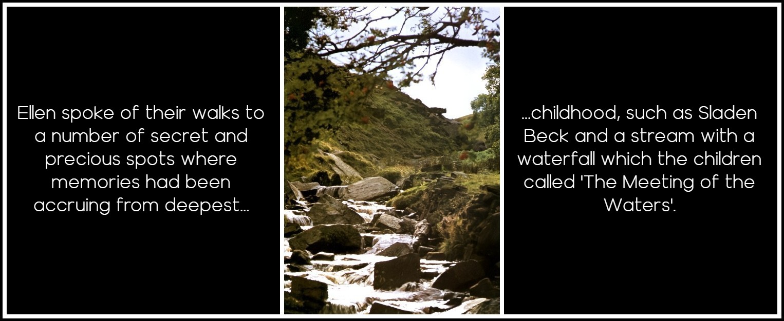 Nevertheless, Ellen has obviously not invented the account of Emily at 15 when she first visited, actually volunteering to take this stranger out for a walk, and opening up into a uniquely communicative mood, impressing the visitor with the geniality and vigour of her mind. Charlotte’s nervous enquiry when they got back as to ‘How did Emily behave?’ has an authentic ring. Ellen also spoke of their walks to a number of secret and precious spots where memories had been accruing from deepest childhood, such as Sladen Beck and a stream with a waterfall which the children called ‘The Meeting of the Waters’: It was a small oasis of emerald green turf, broken here and there by small clear springs: a few large stones serving as resting-places; seated here, we were hidden from all the world, nothing appearing in view but miles and miles of heather, a glorious blue sky, and brightening sun. A fresh breeze wafted on us its exhilarating influence; we laughed and made mirth of each other, and settled we would call ourselves the quartette. Emily, half reclining on a slab of stone, played like a young child with the tadpoles in the water, making them swim about, and then fell to moralizing on the strong and the weak, the brave and the cowardly, as she chased them with her hand. We glimpse here, coming out of hiding, the poet who celebrated ‘All Nature’s million mysteries / The fearful and the fair’. ‘The fair’ is of course easy to love, and is an obvious feature in this refuge of bright green turf surrounding the meeting streams.
