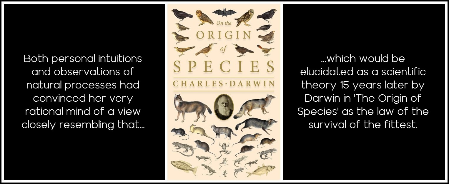 Ellen’s recollection, however, also seems to touch on that other, far less palatable mystery of nature, of which Emily’s poetry did not simply take account but also made its preoccupation, the mystery of ‘the fearful’ aspect of nature, the predatory reality which may underlie any peaceful scene, or that mingling of awe and disturbance with peace in a scrupulous person’s awareness of landscape. Emily is remembered lying out on a stone, dangling her hand in the water like a god from another element, and teasing the underwater creatures, meanwhile discoursing upon ‘the strong and the weak’, disturbing the creatures’ habitat so as to test out their relative powers of adaptation and survival. Ellen says she played ‘like a young child’, but she is also seen studying animal behaviour with an analytic, scientific eye and hand, devising parallels with the behaviour of human animals swimming around in their element. It is very like the deadpan detachment with which she recounted scenes of obscene violence and cruelty in Wuthering Heights: Hareton hanging puppies, Heathcliff ‘grinding down’ his victims. Emily was aware of a power and violence within herself which matched that element of ‘the fearful’ within the natural world, and her lack of inhibition and fear relating to it was raised to the status of a philosophical principle. In one of her French essays written in Brussels, she wrote that ‘life only exists upon a principle of destruction’, so that it is clear that both personal intuitions and observations of natural processes had convinced her very rational mind of a view closely resembling that which would be elucidated as a scientific theory 15 years later by Darwin in The Origin of Species as the law of the survival of the fittest. The weak lose all. The strong inherit the earth. It would have been thought an unforgivably unwomanly point of view, as well as an offensive unchristian heresy.