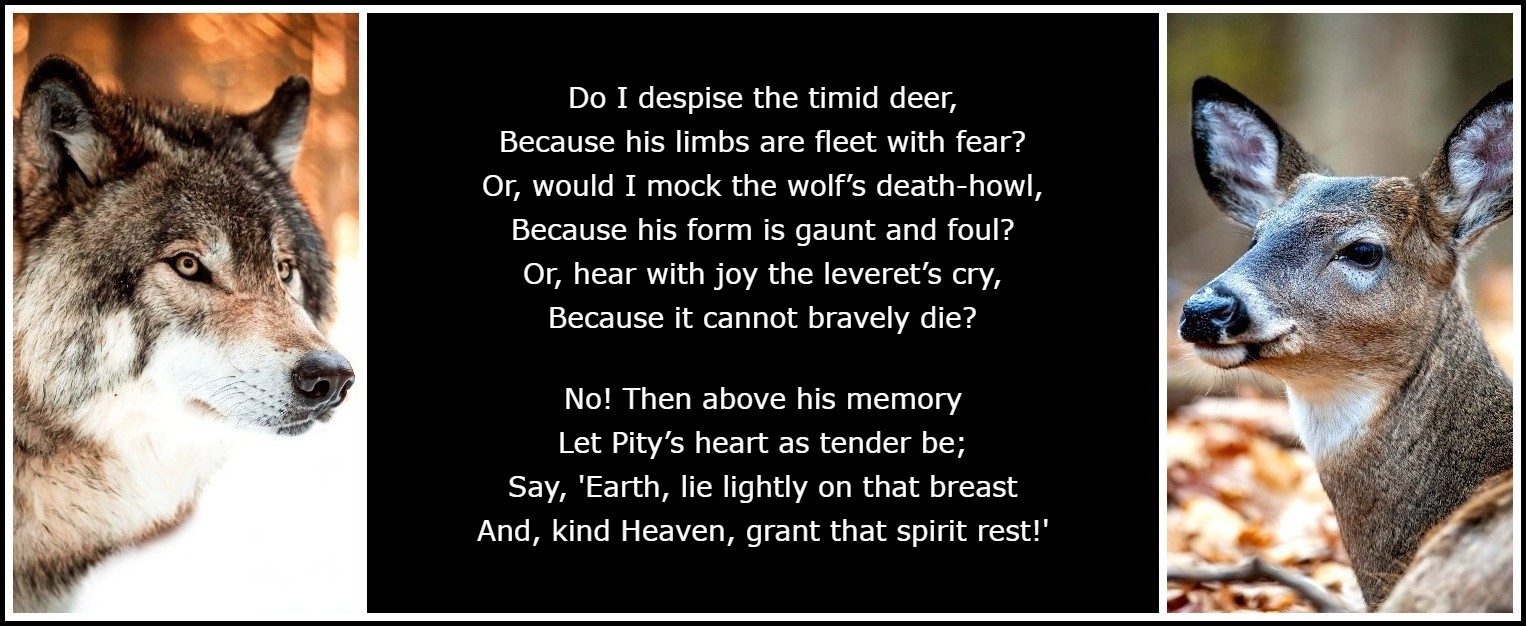 The problem for Emily Brontë lay in deciding who were to be thought of as ‘the fittest’. I think she schooled herself in a compassion that would be based on this natural principle of ‘the strong and the weak’ but which would stretch to embrace both—predator and prey, aggressor and victim—in equal measure. In a Gondal poem of 1839, ‘Well, some may hate’, aged 21, Emily’s persona deliberately revises an instinct to sneer above the grave of a weak and vain person, on the following grounds of the poem presented in the image below. The deer’s timidity is inherited and constitutional, but so is the wolf’s carnivorous appetite. To the final howling of the wolf is added the unbearably high-pitched shriek of the baby-hare, caught in a trap or animal jaws. Compassion is universally and equally apportioned—to the killer and the prey, since both are helpless, at the mercy of inborn responses and inherited conditions. Emily Brontë’s vision of the state of nature here is that of one who sees the subjection of all species to the law of universal carnage, where only the strongest survive, but where the strong are not lovable (the wolf) and their survival is only temporary. Strong and weak in the animal world are subject to the same law, and cannot choose an attitude or stance. Human nature is genetically determined too, so that the dead man, like the young hare, had been born lacking the power to resist his fate or stifle his frailties. Few people have ever had such an absolute conviction of being among the strong as Emily Brontë. But this was only moral strength because it learned to acknowledge the claims of the weak.