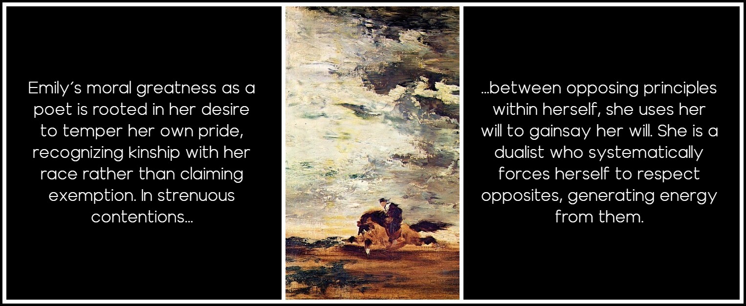 Her poem, like so many others, is in the form of a debate, in which the persona presses the case for compassion and tolerance against something deeply inhumane which lies within himself. I think it represents Emily’s own conflict in coercing herself to abandon or mitigate an instinctive ungentleness toward common frailty, a search for sympathy with those who are voluble in their sufferings, or who cannot make grandiose or epic claims for themselves. Her physical and mental stoicism was so extraordinary that it seems she had constantly to reattune her mind to the evident fact that such qualities must always be rare. In this poem, she records a grudging but successful attempt to concede to the common average. Emily would make several high claims for her superior calibre: ‘Riches I hold in light esteem’, ‘No coward soul is mine’, and these are perhaps her most famous utterances. But her moral greatness as a poet is rooted in her desire to temper her own pride, recognizing kinship with her race rather than claiming exemption. In strenuous contentions between opposing principles within herself, she uses her will to gainsay her will. She is a dualist who systematically forces herself to respect opposites, generating energy from them: in Wuthering Heights, both the raw, wild power such as Heathcliff embodies and the ‘Linton’ qualities of temperance, kindliness and traditional good feeling are acknowledged and polarized. She does not choose the one and abandon the other, but with artistic patience and discipline sustains our sense of the worth of each in its own terms.