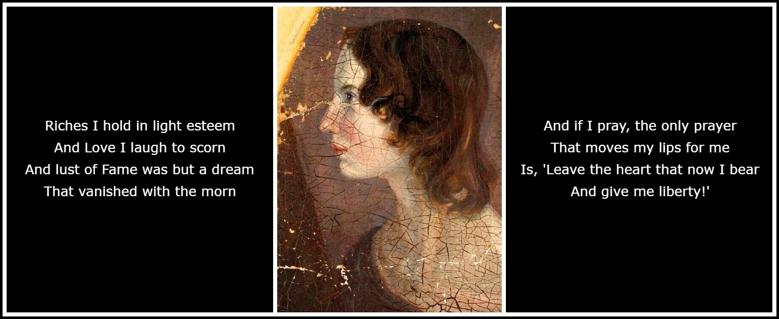 Liberty was not only a state of mind to be entered into, but inhered in a local place to be visited. Emily Brontë’s boast of being untouchable by the preoccupations with wealth, love and fame which animate the inferior majority of people was fortified by the accident of place which provided an area literally on Emily’s doorstep, in which she could breathe oxygen that had been through no one else’s lungs, for hardly anyone ever went there, and move freely and haphazardly because there were no rights of way. This place of liberty, upon which she founded her conception of beauty and her idea of value, and which became essential to her continued health, was the moorland behind her home. The poem above, written at the age of nearly 23, admits that she had been aware of impulses to be economically independent; to seek love; to be known. In place of these transient whims has come an undivided and serious aim, to be left alone. She wishes to be an outsider, because going outside was, literally, pure joy.