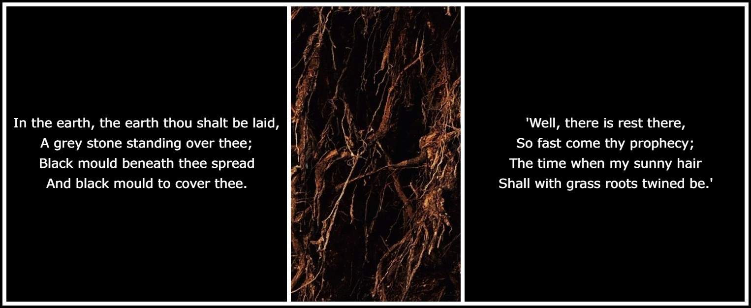 The debate beginning ‘In the earth, the earth’ (presented in the image below), in which two voices argue over whether it is preferable to live or to die, conceives of the mingling of human remains with the underworld mesh of grass-roots as an image of harmony and union. The sombre absence of colour in the first stanza, ‘grey… Black… black’, is implicitly contradicted in the second which manages to yield an impression that the hair which twines with the unseen living roots of grass (as the hair of two people used to be woven together and secured in a locket) will retain its ‘sunny’ character, like buried gold. The grave, in which the corpse is pictured as sandwiched between two layers of ugly ‘black mould’ by the admonitory voice, becomes connected with another kind of living process. Nature is felt, both above and below ground, as man’s original and final home, in which he comes to terms with the mystery of the ‘fearful’.