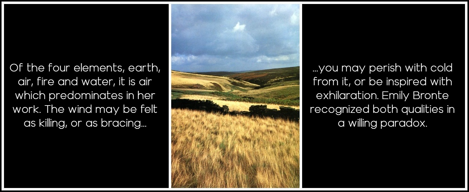 She admired and felt that some principle within her echoed the racing of the wind across the surface of the earth. It was like the careering of Eternity into time which was the pivot of her visionary experiences. The root of the word ‘wind’ in Hebrew has the same meaning as our word ‘spirit’, and this fruitful pun which is traditional in Christian tradition, is a coincidence on which Emily Brontë drew. ‘The wind bloweth where it listeth’ is rendered in some Biblical translations as ‘The spirit bloweth where it listeth’. The wind is liberty; and to stand in it is to be free. It is also the unifier and reconciler in Emily’s vision, like Wordsworth’s idea of a spirit which ‘rolls through all things’ in Tintern Abbey. But because Emily Brontë was always thinking not of an abstract ‘spirit’ but of a wind localized in Yorkshire, a real blustering force which you have to resist in order to maintain your own stance, her conception of this old idea has a powerful originality. The high winds around Penistone Hill and Withens (the supposed original for Wuthering Heights) are relaxing because the necessity for keeping upright entails forgetting to be conscious. They disperse consciousness; cleanse and renew. These are the feelings and experiences Emily is drawing on when she has Catherine, dying from the suffocation her nature feels in the enclosure of Thrushcross Grange, battle to get the window open, so that she can take some of this vital air into her lungs.