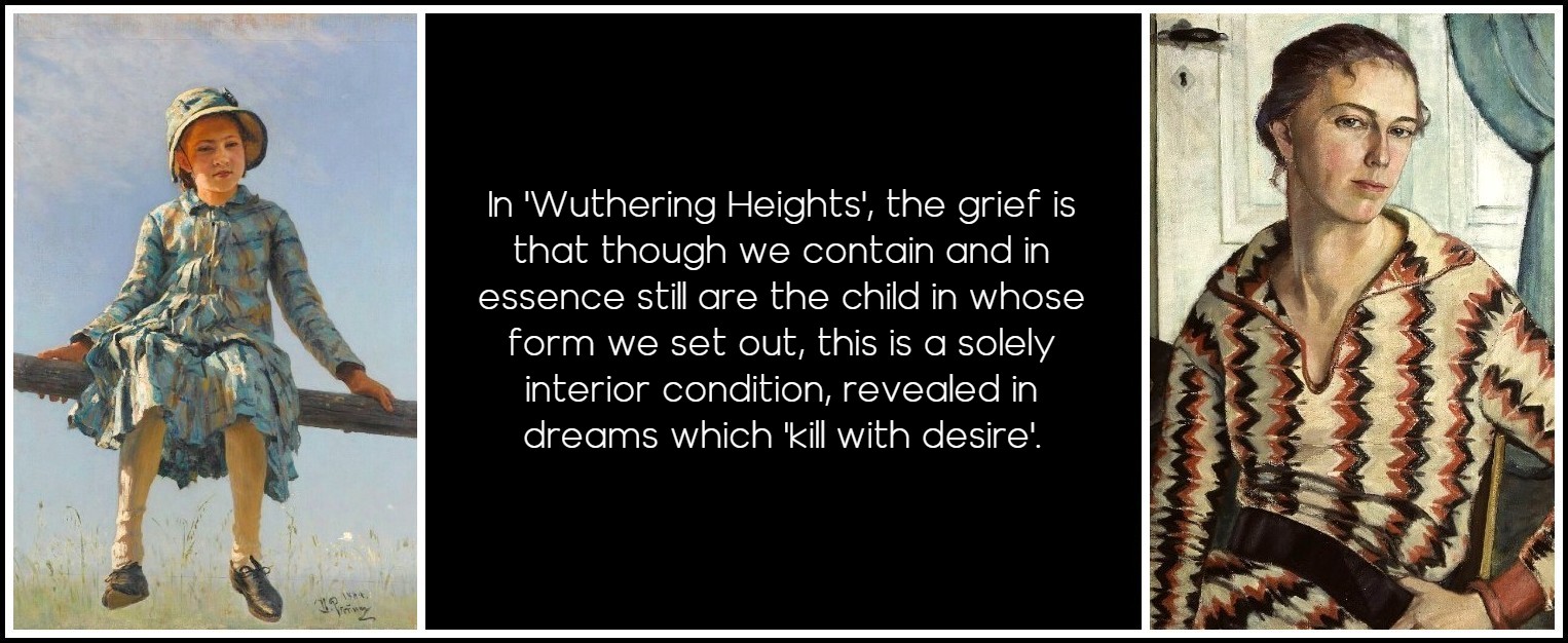 Ellen is right to say that the freezing blast will kill Catherine, physically; Catherine right to insist that to drink that air will heal her, spiritually. The tragedy lies in the fact that the two modes of life are shown as not consonant. To achieve the life of one, you must lose the other. To ‘be oneself’ is the most invincible problem raised by the novel. To ‘be herself’ Catherine knows that she must go back; go home. Emily’s novel reveals the fatality involved in growing up, being consigned to time. Nothing can be unwoven, for the web of destiny has been spun, measured out and will be cut. Catherine yearns, ‘I wish I were a girl again, half savage and hardy, and free’, for this is the only way one could get back. She feels that the wind, coming in from her home on the moors, is somehow the clue to getting back across the abyss. It is, but only through the process Ellen so sensibly counsels against, by killing her. In Emily Brontë’s novel, the grief is that though we contain and in essence still are the child in whose form we set out, this is a solely interior condition, revealed in dreams which ‘kill… with desire’. Though it may be theoretically possible to recreate childhood, this can only be subconsciously or through the quickened memory, for there is no permit available from adult life back to the Eden of childhood. Adult life is shown by Emily Brontë as a condition of forfeit and exile—exile even from ‘being oneself’.