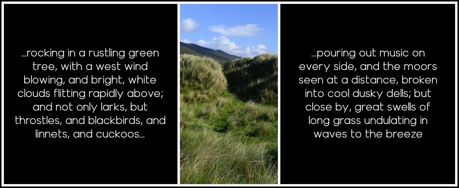 Catherine cannot rejoin Heathcliff in the old way of life: she is married, pregnant, ill and mortal. Heathcliff cannot undo his separation from Catherine in her life-time, for the same reason, and after her life-time because that requires that he survive ‘with (his) soul in the grave’, and, obviously, ‘I cannot live without my life! I cannot live without my soul!’ But there is a suggestion that there does exist a path home on two levels: through that chill, inhuman wind turning one’s life to air, returning one’s body to the mould; through giving birth to a new identity. Catherine is displaced to the younger Cathy. A new child goes out into the world; makes for the Heights instinctively, where the wind’s source is. When Cathy grows up in her turn, she expresses her dream of Paradise presented in the image below. The west wind associated with the return of spring, and with the extravagant symphony of birdsong (song itself is air), co-exists in this poetic speech with one of the most accurately observed and naturalistic images anywhere in Emily’s works, the sea of grass blown upon by the wind. For Cathy as for the author, Paradise is a condition of resolute wakefulness; nothing is quiescent or acquiescent. The wind has turned the acres of meadowgrass to a billowing sea, ‘swells… undulating’, as the invisible force which animates all existence miraculously reveals its presence through its effect upon the visible, pressing down and releasing the grasslands in a rhythmic succession of waves of energy. A violent force expresses itself in effects which are soft to the eye—absolute power; absolute gentleness. This commonplace sight on the hillsides around Haworth is looked at with a fresh, transforming vision.