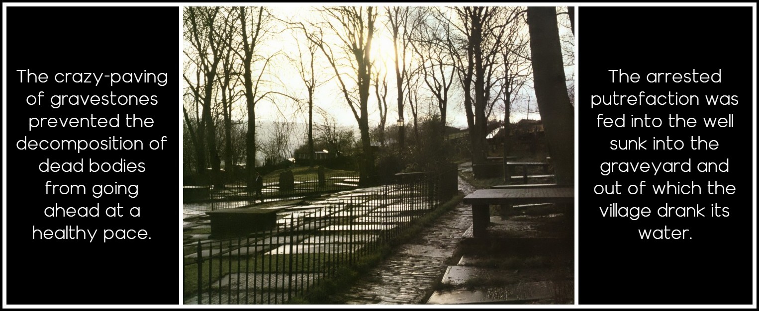 Haworth Parsonage and Church stand on the border of the village whose cobbled main street fell steeply down to the valley, flanked by terraced weavers’ and wool-combers’ cottages of massive local stone, and crowded with 4,000 inhabitants living in great squalor. Outside the front windows, an army of Haworth dead reposed under dark wedges of stone without a blade of grass to be seen. This crazy-paving of gravestones prevented the decomposition of dead bodies from going ahead at a healthy pace, and the arrested putrefaction was fed into the well which some aberrant engineer had sunk into the graveyard and out of which the village drank its water. Typhus was endemic. In the vault of the church itself other corpses lay, exuding the scent of putrefaction into the nostrils of the worshippers. Haworth could claim to be one of the most unhygienic corners of England, full of overflowing cesspits and middens which made it prudent to tread carefully along the road. Infant mortality stood at 41%. Emily as a little girl looked down from the parlour or nursery window upon this prospect.