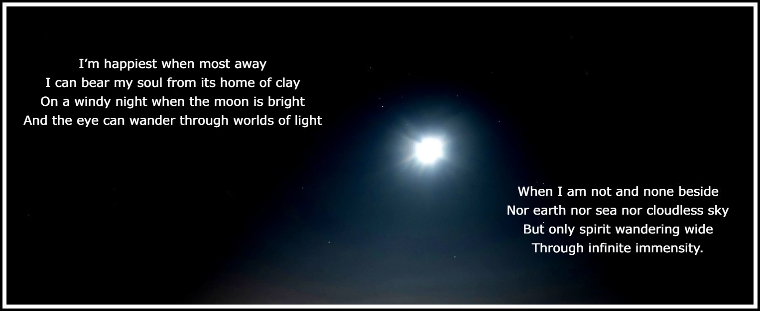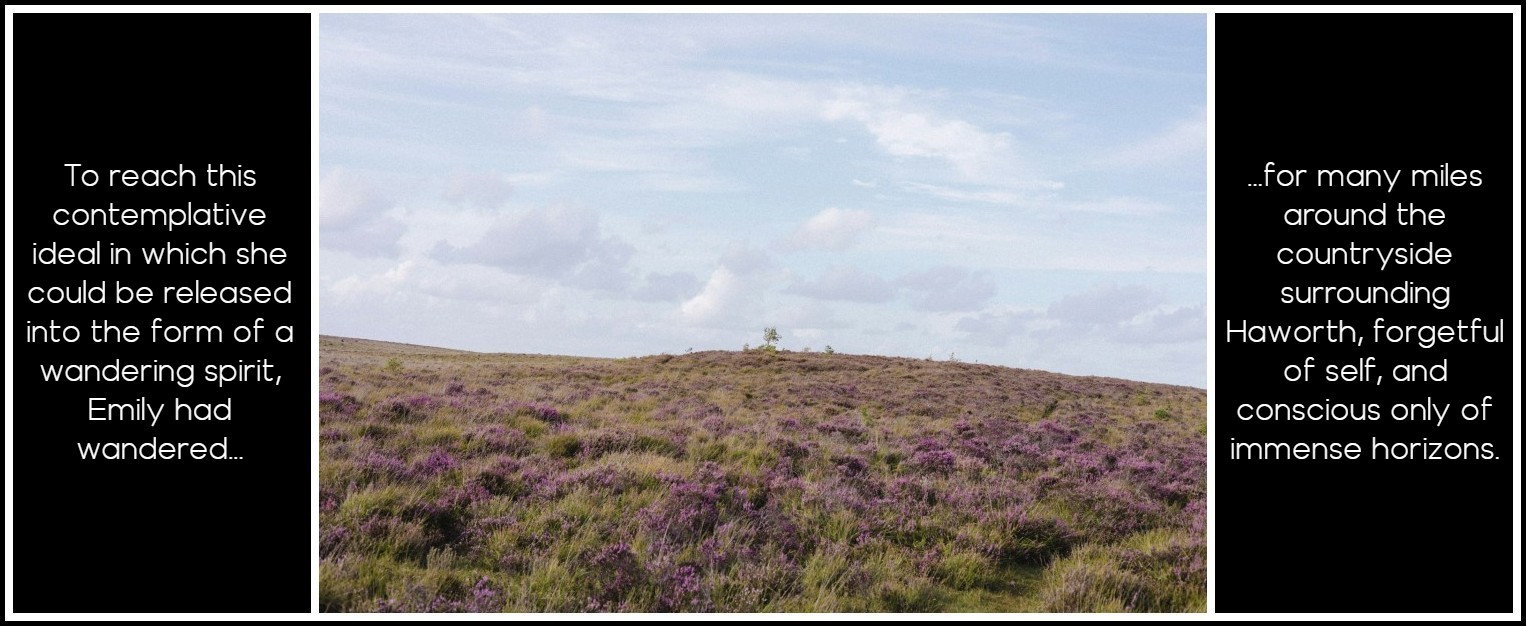 Not to be, or to be bodiless, is here to be ‘happiest’. An idea of what she might mean by the abstraction ‘infinite immensity’ is given by the denial of earth, sea and sky as wholes in favour of spaces bounded by no limit, compared to which earth, sea and sky would appear too detailed and specific. To reach this contemplative ideal in which she could be released into the form of a wandering spirit, Emily had wandered for many miles around the countryside surrounding Haworth, forgetful of self, and conscious only of immense horizons. Clues to the freedom she seeks here had been sensed in the solitude of the high moors.