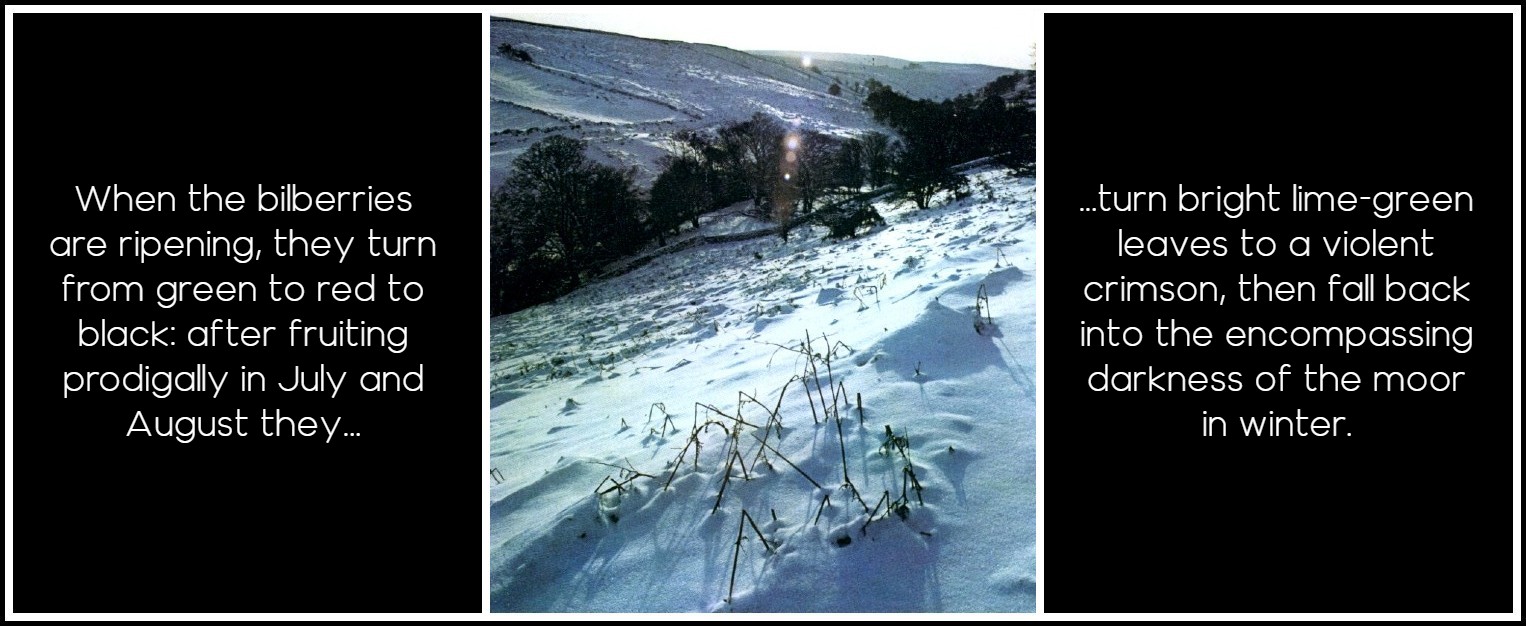 It was not only the large planes and surfaces of the moors which she loved, but also their colour and detail, and the few animals whose habitat is there. The purple heather, calluna, which covers the moors and the bilberry bushes which offer a kind of manna in that wilderness of heath, are often mentioned in Wuthering Heights. These are the principle source of colour. When the bilberries are ripening, they turn from green to red to black: after fruiting prodigally in July and August they turn bright lime-green leaves to a violent crimson, then fall back into the encompassing darkness of the moor in winter. For Emily the moors mean rest, clement on the very verge of annihilation. At the end of Wuthering Heights the graves of Linton, Catherine and Heathcliff are to be crept over in course of time by the grass and heather of the moor. There are no hideous flagstones committing their inmates to the eternally cold mercies of their architecture, but rather the organic absorption of those persons into the peaty moor itself, secure and wholesome. The grass which covers the graves, simple and common as it is, is a manifestation of the natural world which Emily contemplated with love and respect.