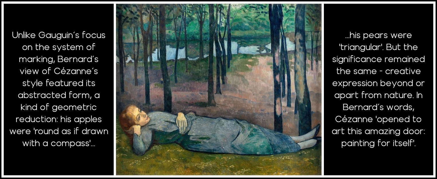 Whatever Cézanne happened to do and say in 1881 led Gauguin to understand the separate, juxtaposed marks as the painter’s successive ’sensations’. Gauguin either adopted, appropriated, or stole Cézanne’s technique—the choice of verb would depend on the attitude or allegiance of whoever was telling this story—and along with Cézanne’s mark came his sensation. ‘Forthright, uniform, supple, and grand’, was Maurice Denis’s description of Gauguin’s own brushstroke; and he added immediately that its character had been ‘acquired evidently from Cézanne.’ ‘Gauguin, absolutely the first in this respect, had a limitless admiration for Cézanne.’ Gauguin perceived that the patterning of Cézanne’s side-by-side marks, their orientation in relation to the picture surface, did not necessarily follow the volumetric contouring of the cultivated fields, the trees, or the still-life objects being represented. An apple was round; its constituent marks might be vaguely rectilinear. Beyond the fact that Cézanne’s technique defied the conventions of naturalistic imitation, it bore a remarkable implication: ‘sensation’ was no longer something to be recorded (as a view or ’study’ of nature) but something independently created (as the painter’s internalised vision or dreamlike, imaginative projection [rêve]). This was noted by Emile Bernard, who in 1891 became the first to devote an interpretive essay to Cézanne; like Sérusier, Bernard had been a member of the ‘School of Pont-Aven’ during the late 1880s (see Madeleine in the Bois d’Amour, 1888). He developed his interest in Cézanne prior to meeting Gauguin, but Gauguin caused that interest to deepen. Unlike Gauguin’s focus on the system of marking, Bernard’s view of Cézanne’s style featured its abstracted form, a kind of geometric reduction: his apples were ‘round as if drawn with a compass;’ his pears were ‘triangular’. But the significance remained the same—creative expression beyond or apart from nature. In Bernard’s words, Cézanne ‘opened to art this amazing door: painting for itself.’