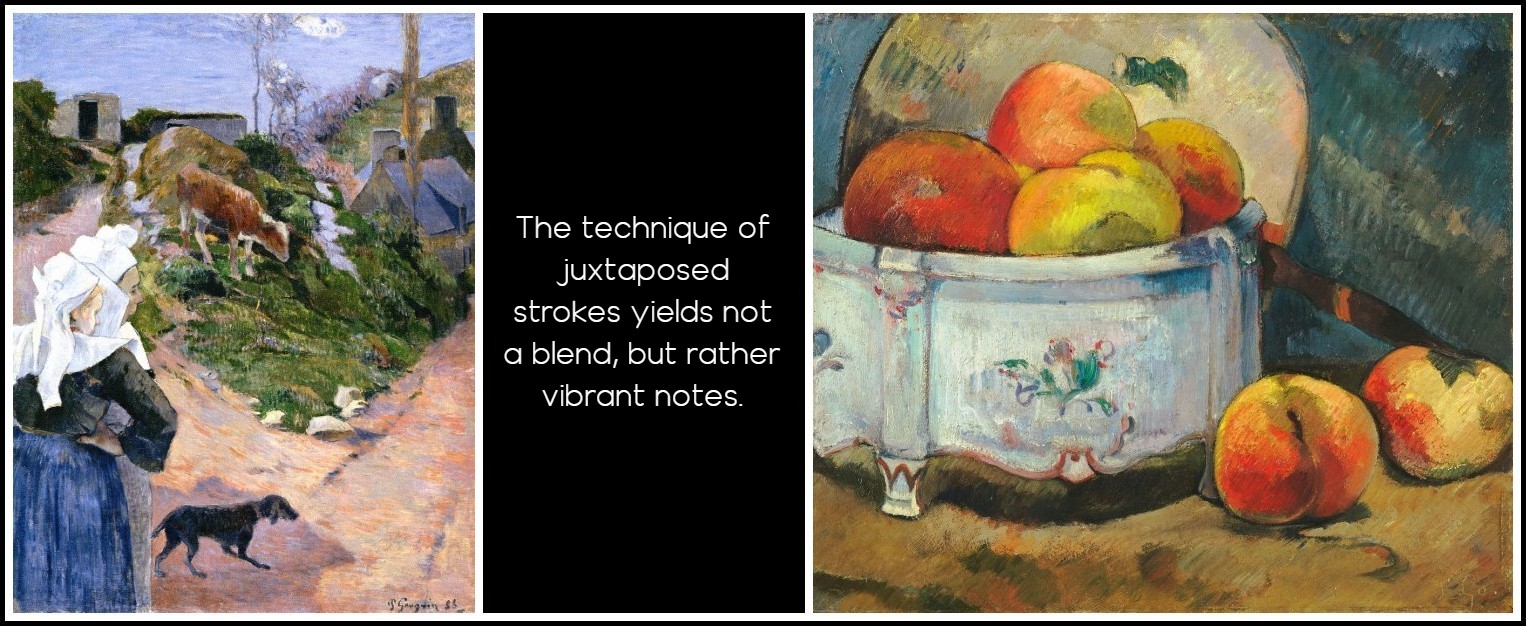 …Breton Women by a Bend in the Road (1888), and Still Life with Peaches (c.1889). In 1885 Gauguin reflected on his new practice, indicating that the technique of juxtaposed strokes was at its core: ‘People complain about our unblended colours, set one against the other. Yet a green beside a red does not yield a reddish brown, as in physical mixture, but rather two vibrant notes.’