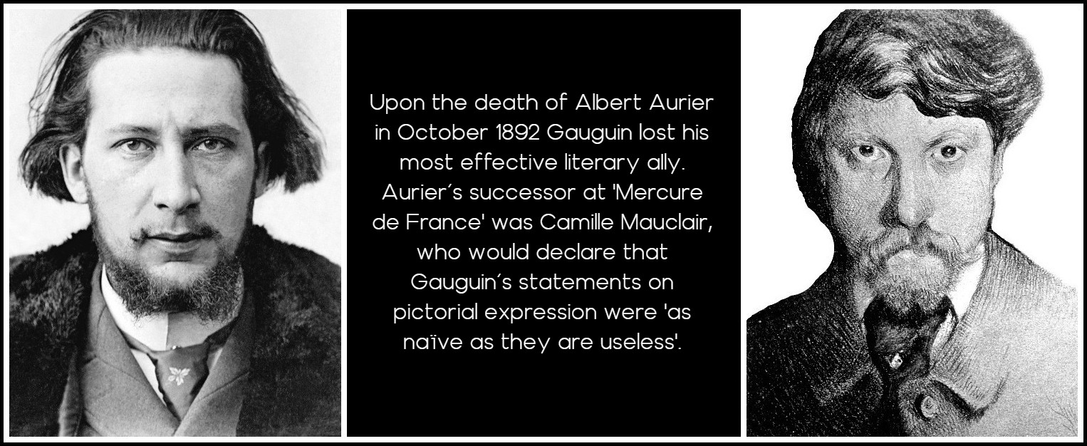 Aurier’s second article on Symbolist painters (April 1892) reconfirmed Gauguin’s Symbolist identity, characterizing his art as ‘Platonism plastically interpreted by a wild man of genius.’ Gauguin, so to speak, was a genius in ‘the wild.’ At that time, he was on his first visit to Tahiti (April 1891 to July 1893),where he was enacting the theoretical links between primitif, sauvage and Symboliste. Calling Gauguin a Platonist made him appear more philosophical and programmatic than he was, but Aurier’s position was true to the artist in stressing as the source of his expression imaginative fantasies, dreams and emotionally evocative ideas, as opposed to delimited observations of the external environment. Having received word in distant Tahiti that Aurier was continuing to praise him, Gauguin was inspired to proclaim his Symbolist leadership even more boldly: ‘I created this movement in painting and many young artists benefit from it. Nothing in them comes from them; it comes from me.’ In October 1892, however, Aurier died suddenly from typhoid fever; and Gauguin lost his most effective literary aIly. Aurier’s successor at Mercure de France was Camille Mauclair, who would declare that Gauguin’s theoretical statements on the topic of pictorial expression were ’as naïve as they are useless’. In this respect, Gauguin’s theory was hardly different from his pictures: ‘His dogs painted red, his cabbage-green trees, his pink skies.’ To Aurier such exaggerated, simplified color conveyed the kind of ‘abstract meaning’ he advocated, ‘the ever-changing drama of abstractions’—pure ideas, symbols, at once intellectualised and spiritualised. To Mauclair, these claims were nonsense.