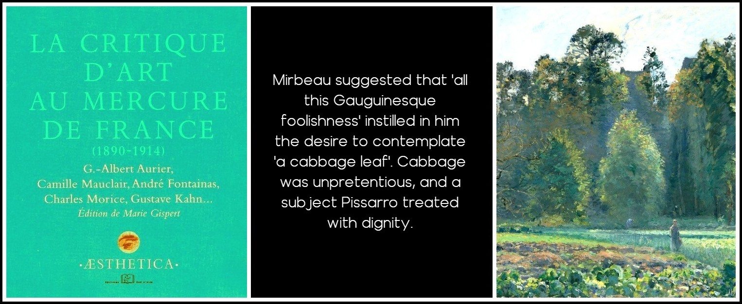 Aurier may have impressed Gauguin, but many others were either puzzled by or actively refuted his analysis. Among them was Pissarro, whom Aurier faulted (along with Impressionism in general) for concentrating on the material aspects of reality. Pissarro, in turn, took offense at the critic’s use of the concept of émotivité, which, for an artist, is both a sensitivity to emotional stimulation and the capacity to project emotion. Aurier identified Gauguin with émotivité, while implying that Pissarro lacked it. With regard to subjectivity or emotional content, Pissarro saw little fundamental difference between the old Impressionism and the new Symbolism; both were, or should be, imaginative in their content, individualistic yet fully rational in their technique. Pissarro presented the matter to his son Lucien, who observed that émotivité was just another word for what the Impressionists had always called ‘sensation’—an impassioned, personalised, emotional act of perception. Pissarro inferred from Aurier’s ‘Le Symbolisme en peinture’ that with so much emphasis on intellectual musing and fantasy, art would lose its physical involvement with material form. It would become all conception and no execution, no work. Pissarro concluded that if Aurier’s position were taken to its inherent ‘absurdity’, artists would ‘no longer need to draw or paint.’ At one point, the writer Octave Mirbeau, friend of Pissarro and occasional supporter of Gauguin, encountered Aurier on the street: ‘I explained to him that you were a great idealist’, Mirbeau reported to Pissarro in December 1891. Mirbeau was implying that, like Pissarro, he failed to see any clear division between Impressionist and Symbolist ends. To this, as to all that Mirbeau asserted, Aurier placidly concurred, as if unable to articulate a contrary opinion. With the same sarcastic exasperation, Mirbeau suggested that ‘aII this Gauguinesque foolishness’ instilled in him the desire to contemplate ‘a cabbage leaf’. Cabbage was unpretentious, something familiar to ordinary working men, and a subject Pissarro treated with dignity.