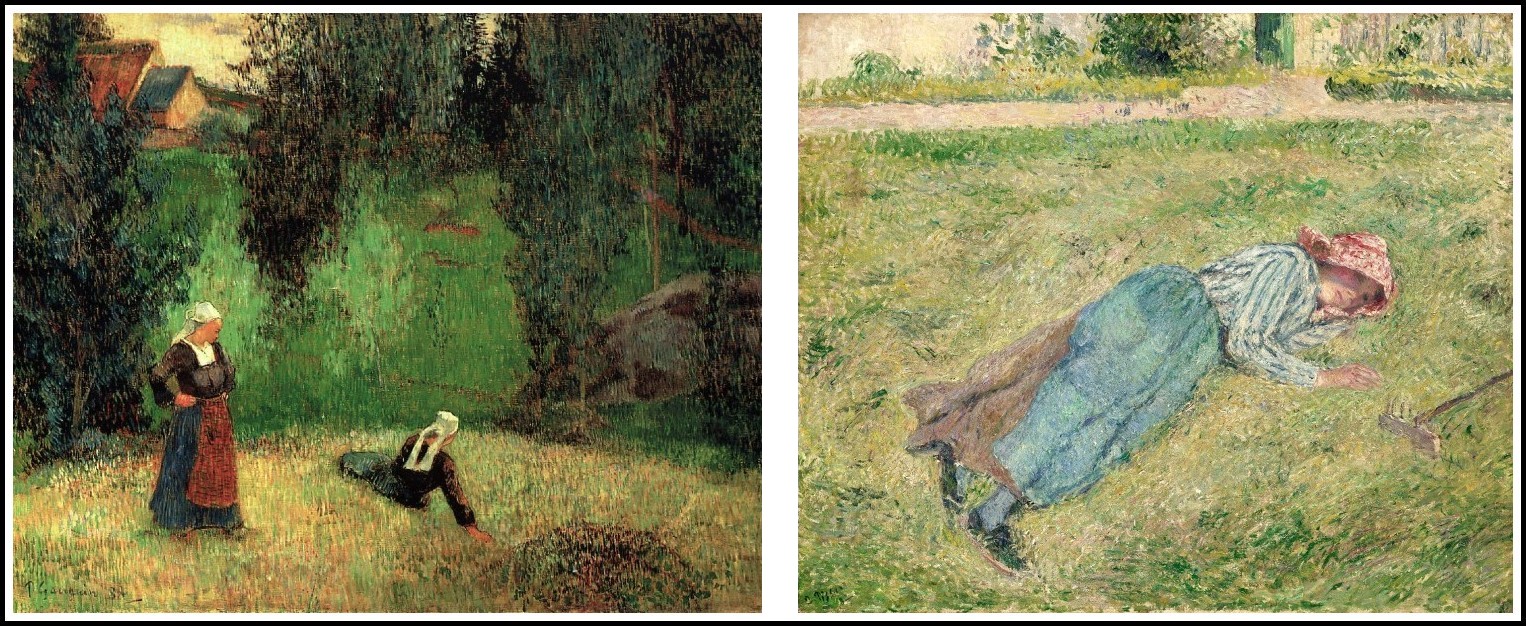 Gauguin, Spring at Lézaven, or The First Flowers, 1888 | Pissarro, The Rest: Peasant Girl Lying on the Grass, 1882