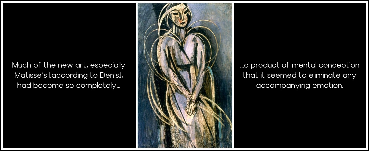 Much of the new art, especially Matisse’s, had become so completely a product of mental conception that it seemed to eliminate any accompanying emotion: ‘Painting apart from any contingency, painting in itself, the pure act of painting, lacking our instinct for nature.’ ‘Abstraction’ and ‘form’ had been pushed so far that neither sensible reason nor human feeling, but only misguided theories, could justify the new practices.