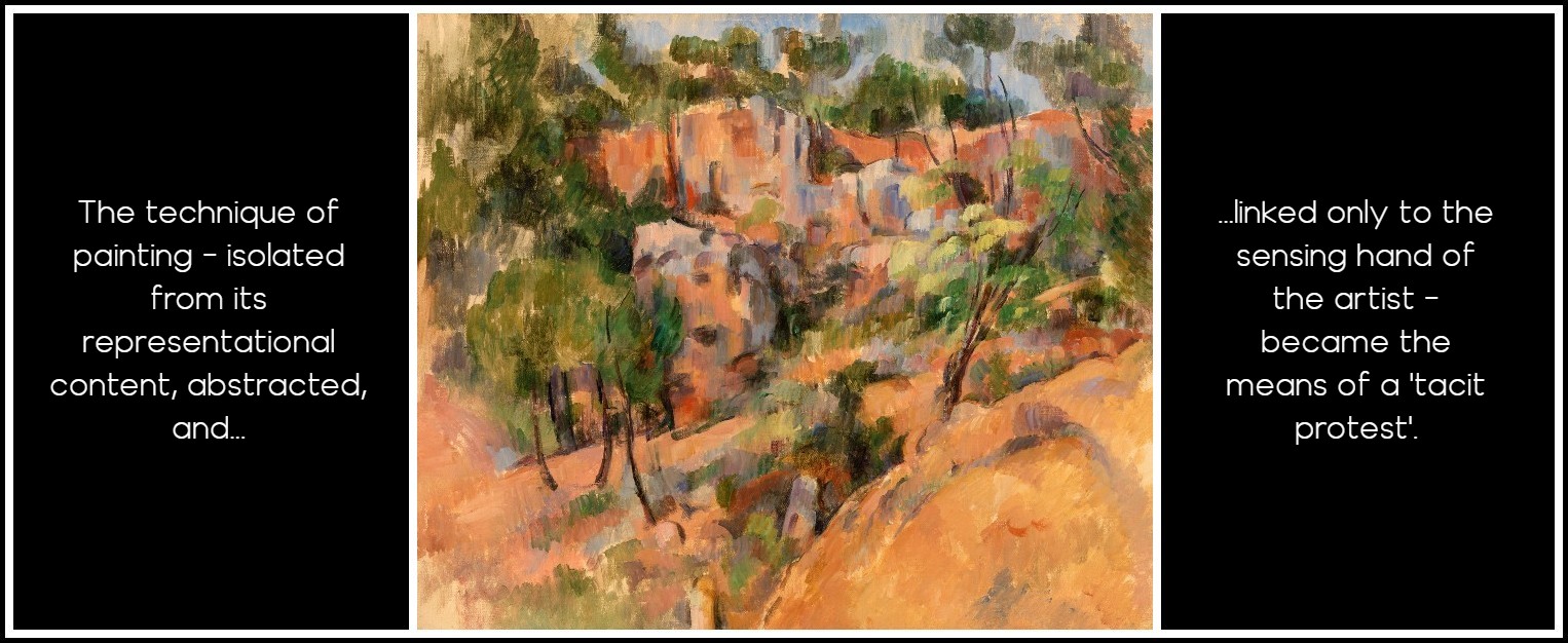 In lieu of intellectual and ethical abstractions, the painter produced colour abstractions. Cézanne did not lack political, religious or philosophical beliefs, but he appeared resigned to the fact that theoretical and ideological concerns could no longer guide his or any other artistic practice. The technique of painting—isolated from its representational content, abstracted, and linked only to the sensing hand of the artist—became the means of a ‘tacit protest’. To the sensitive critic, it signalled the corruption of the intellectual and moral bases of modern society. Acknowledging Cézanne’s impenetrable mystery, Morice added parenthetically: ‘Was his protest fully conscious? I don’t know.’