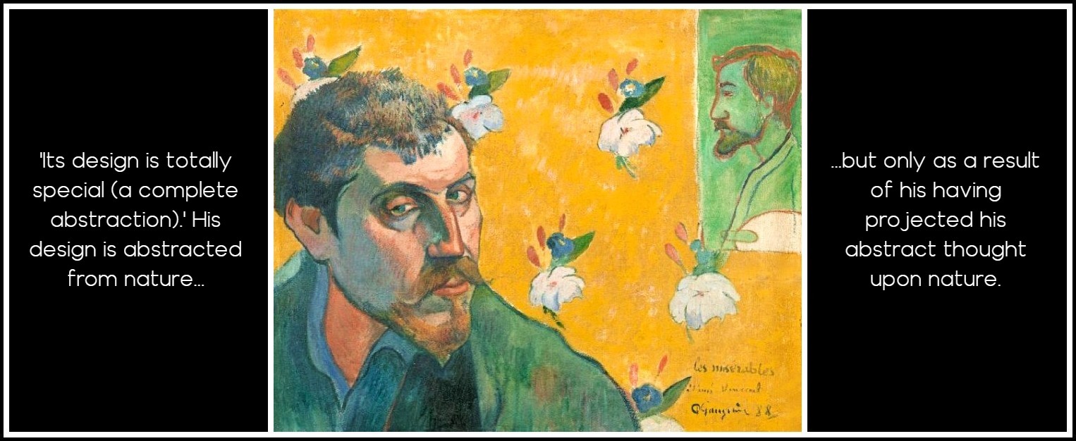By this process of projection and extraction, an artistic image became what Gauguin called ‘an abstraction’. As a drawing-away or drawing-from, abstraction isolates the points of contact between a subject (the artist) and an object (nature). When Aurier referred to ‘the symbolism of the abstract elements of design’, his word abstrait indicated that the expressive factor in visual art could be drawn or separated out, isolated and hence intensified to create a specific emotional and ideational effect. To use a colour without concern for its naturalism (whatever in nature it might resemble) would abstract from the general experience of that colour its specifically expressive, symbolic quality. Gauguin’s kind of abstraction—as opposed to the rule-bound, academic abstraction of ‘official’ art—touched on emotions that lay beyond the intellectual comprehension of ordinary referential language. This is why he told Morice that his viewers needed to experience ‘emotion first; understanding afterward.’ In 1888 Gauguin described the self-portrait he was sending to van Gogh in anticipation of their planned painting campaign in Arles: ‘Its design is totally special (a complete abstraction).’ Here the descriptive term ‘special’ indicates that the form is specific to Gauguin’s thinking, his dreaming. His design is abstracted from nature, but only as a result of his having projected his abstract thought upon nature. His approach to writing was analogous: ‘I wish to write the way I make my paintings, that is, by my fantasy, according to the moon [emotion], and to find the title [understanding] long afterward.’