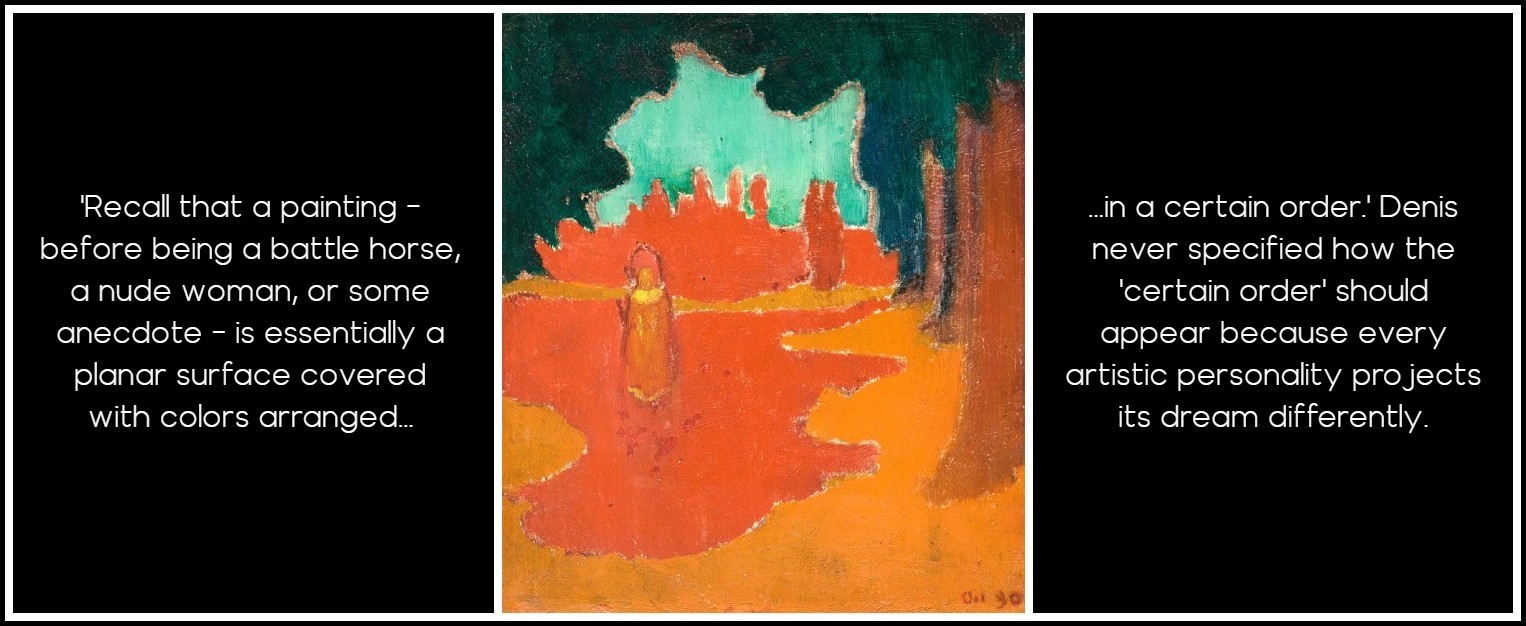 Less than a year after Sérusier formulated his thoughts, Denis published his own Gauguinesque definition of painting, which has often been regarded as a theory—fifteen years before the fact—of twentieth-century formalist and abstract art (see Denis, Patches of Sun on the Terrace (1890). With his simple qualifier ‘certain’, Denis incorporated Sérusier’s notion of infinitely varied personality: ‘Recall that a painting—before being a battle horse, a nude woman, or some anecdote—is essentially a planar surface covered with colors arranged in a certain order.’ Denis never specified how the ‘certain order’ should appear because every artistic personality projects its dream differently. An artist’s colours (the abstracted material factor) express the artist’s thought and vision (the abstracted psychological factor). The result might prove to be either universalising or isolating.