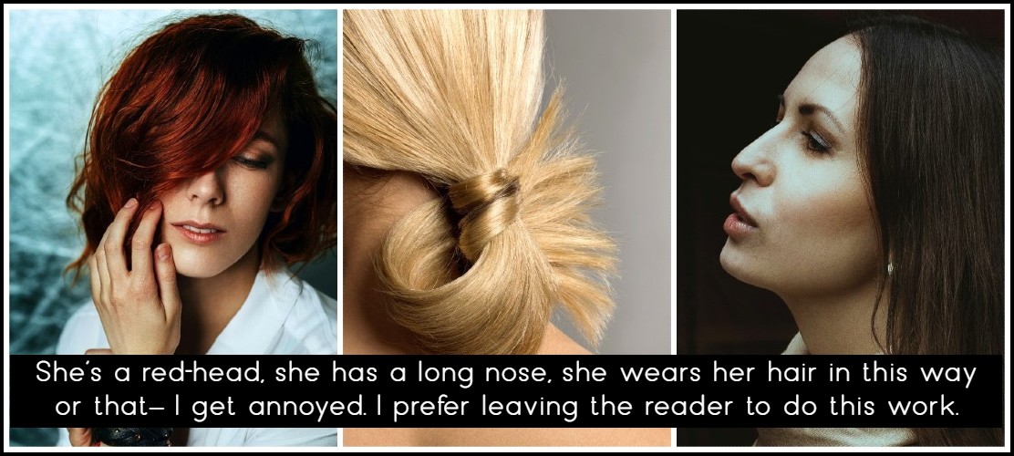 When I read a novel and have to commit all those details to memory—she’s a red-head, she has a long nose, she wears her hair in this way or that, and so on— I get annoyed. I prefer leaving the reader to do this work, to form his own image, so he doesn’t have to worry about forgetting if a character’s hair is straight or curly.