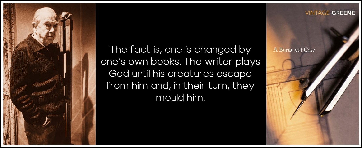 That’s true. Most people will tell you that James liked to describe delicate scenes of picnics on English-style lawns. One of my reasons for liking Henry James is his sense of corruption and horror. I suppose one can work very hard to accomplish a certain task—writing—and that as a result one can’t be a very diligent husband or lover. Perhaps writers are fickle by temperament, because the individual who finishes a novel bears little resemblance to the one who began it. One lives so long with one’s characters that they tend to influence one. For instance, my last bout of depression, my worst, I think, coincided with the gestation of A Burnt-Out Case. I can find reasons for this in my private life, but also in my two-year cohabitation with the deeply depressive Querry, with whom I never in fact identified myself. The fact is, one is changed by one’s own books. The writer plays God until his creatures escape from him and, in their turn, they mould him.