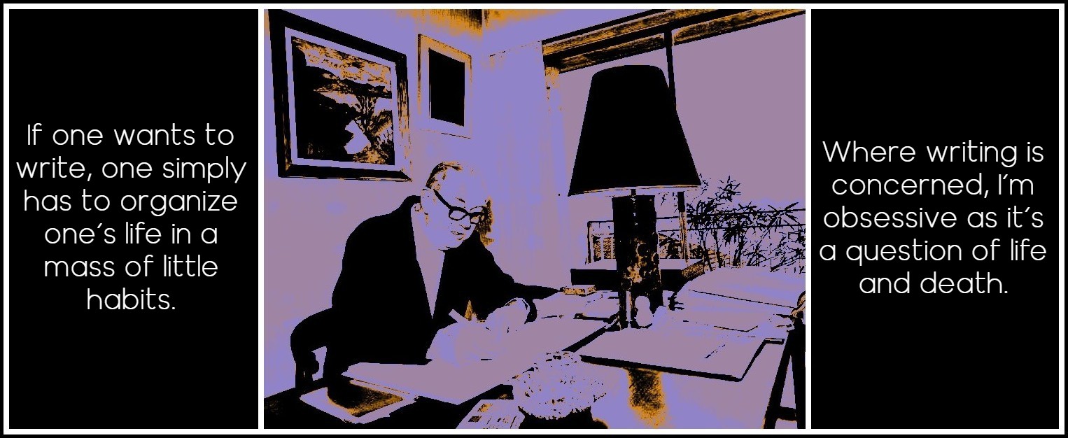 If one wants to write, one simply has to organize one’s life in a mass of little habits. Where writing is concerned, I’m obsessive as it’s a question of life and death. Writing has to develop its own routine. When I’m seriously at work on a book, I set to work the first thing in the morning, about seven or eight o’clock, before my bath or shave, before I’ve looked at my post or done anything else. If one had to wait for what people call ‘inspiration’, one would never write a word. I count my words, I count them all up with my finger. When I’m hard at work, I try to keep to a minimum daily word-count. A chapter contains so many words, and one wants to know exactly how one chapter balances another by its weight in words. For me it’s also a way of forcing myself to work; I used to set myself a quota of at least 500 words a day—which doesn’t mean that I never wrote more. My quota has dropped to 300; when I reach this number I note it in the margin. You’ll find my manuscripts peppered with little crosses and the annotation ‘600’, ‘900’, ‘1,200’, etc. I know by and large how long a book will be when I finish it. As for my ‘productivity’, I used to write a book in nine months, but now it’s one every three years.