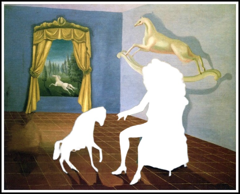 The horses are intertextually related to the written works Pénélope and ‘The Oval Lady,’ and the hyena reappears in the short story, ‘The Debutante’. In Self-Portrait the seated woman’s mane-like hair finds an echo in the horse’s mane and the hyena’s color. The black female hyena coming toward the seated Leonora from the left has its feet on the earth-brown floor and matches the woman’s black shoes. The white rocking horse (Tartar), on the right, is positioned in the air, above her, his rocker touching her mane, his white color matching her riding breeches, apparently galloping toward the window in the background. The color of the window wall and of the sky seen through it is blue, the color of imagination and the other side of the mirror: time and space have been abolished outside the room, where the hobby horse has become a real steed speeding into the trees. The natural green landscape reflects the color of the woman’s jacket; she is also both outside and in. Green is the color of the plant world, of regeneration, life’s awakening, strength and hope; also of acidity and of Persephone’s pomegranate seeds, Hades’ gift of male temptation.