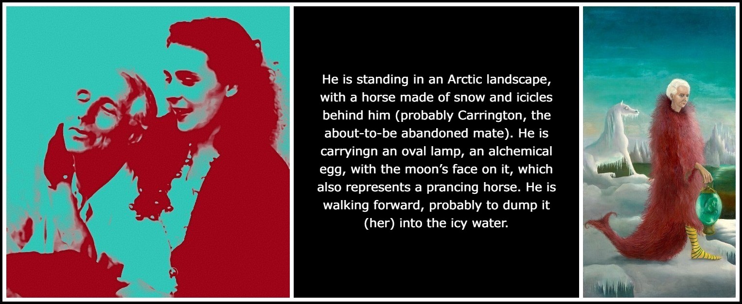 The Portrait of Max Ernst is situated on the other side of the window. Max, with a pinched stubborn expression, appears as a hybrid creature: his own human head, hand and foot (the yellow-and-black striped sock evoking a stinging insect) emerge from an aggressively male red fur garment in the shape of a seahorse. He is standing in a desolate blue-and-white Arctic landscape, with a horse made of snow and icicles behind him (probably Carrington, the abandoned or about-to-be abandoned mate). He is nonchalantly carrying at arm’s length an oval green lamp, an alchemical egg, with the moon’s face on it, which also represents a prancing horse. He is walking forward, probably to dump it (her) into the icy water. He seems to be leaving her,1 just as Uncle Ubriaco abandons Little Francis in Carrington’s tragicomic story ‘Histoire du petit Francis,’ which can be read as a barely disguised account of the couple’s years in St. Martin d’Ardèche, where they had moved from Paris in 1937. The war brutally dislodged and separated them in 1940.