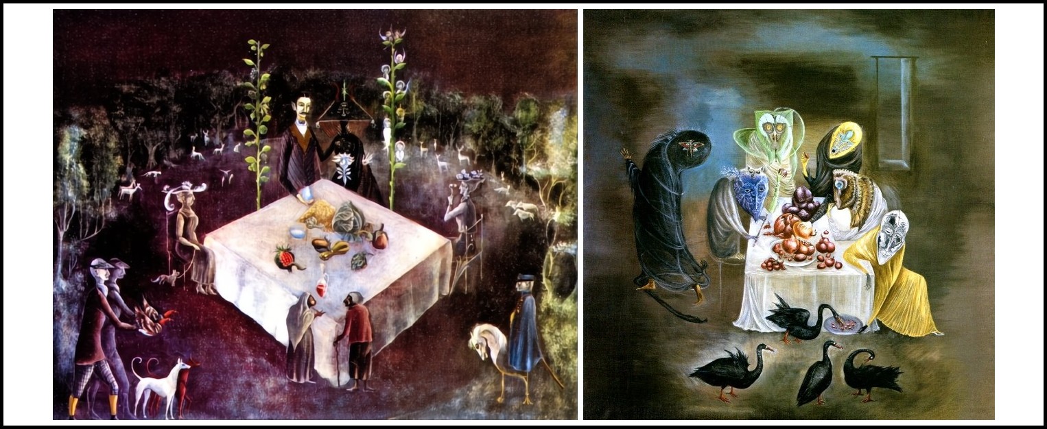 Both sides of the paradoxical eating theme as related to the Goddess-provider of good crops and natural foods, on the one hand, and devourer of her own young (an attribute of two of her animal forms—the sow and the cat— on the other, are amply represented in Carrington’s fiction. People enjoy good meals in The Hearing Trumpet and in ‘Jemima et le loup,’ for example, but violence and cannibalism color ‘The White Rabbits,’ ‘The Debutante,’ and ‘The Sisters.’ Yet in Carrington’s paintings meals seem to consist uniquely of fruit, herbs and vegetables, the Goddess’s peaceful gifts. In Hunt Breakfast, a table has been set in a forest clearing, surrounded at a distance by live game, deer, and wild boar (two of the goddess’s main forms), while the meal, like the Lepidopteros’, is composed only of fruit. Two ‘huntsmen’ are arriving with a gift of live birds. The hostess has a butterfly’s head, perhaps in reference to the Mexican Zapotec butterfly god symbolizing rebirth. The message is clear: the butterfly goddess has transformed the hunting ritual into peace and harmony between men and animals.