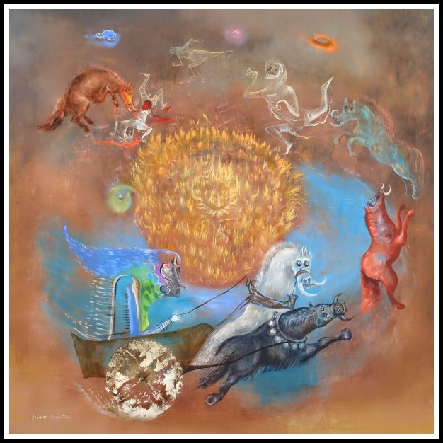 Carrington replied in 1942 with the text ‘The Bird Superior, Max Ernst,’ illustrated with her portrait of him. Concerning the appellation ‘Bride of the Wind’, the White Goddess, according to Robert Graves, was in charge of the winds, one of which was the answer to a riddle, just as ‘man’ was the answer Oedipus correctly gave the Sphinx. Only pigs and goats (sacred to the Goddess) could see the wind, and mares could conceive merely by turning their hindquarters to the wind. This equine myth was transmitted to the Greeks, who personified the North Wind as Boreas, the sire of twelve wondrous colts. These legends posit the wind as a pre-patriarchal male, giving his Bride an original matriarchal context. In another early picture, Horses, Carrington uses the same colors as in Self-Portrait, but here the noble animals have the world to themselves; no Yahoos or other creatures are to be seen in the reddish brown landscape, resembling the decor of a Western. The foreground shows a closeup of a black-and-white stallion and a golden mare happily copulating, a blanket loosely wrapped about her neck. Other horses of various hues are scattered in the background, some inside of or atop a building. In the distance a mirage-like lake hints at the unreality of this prehuman paradise.