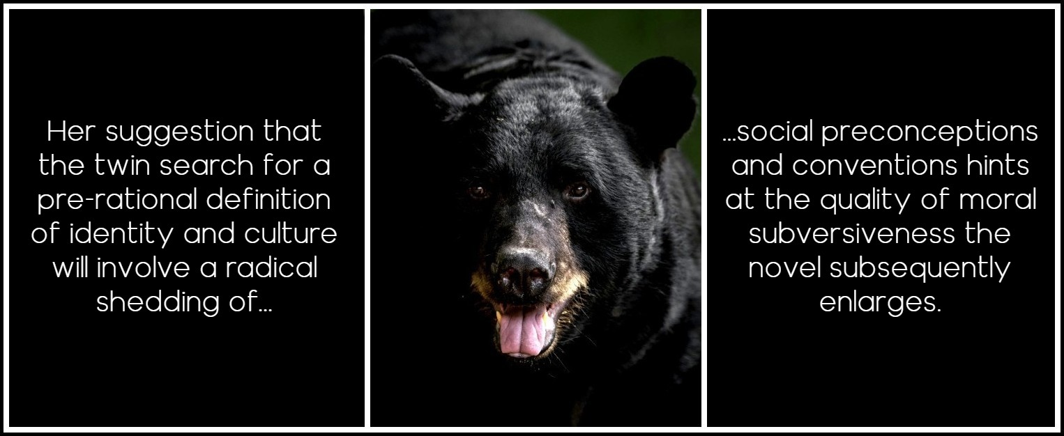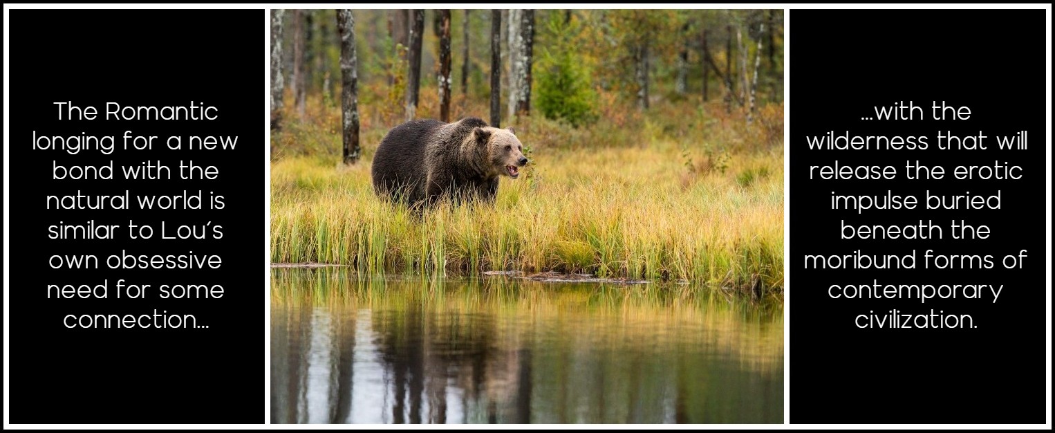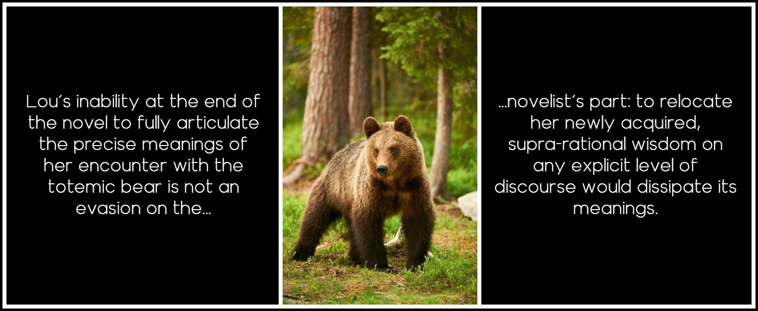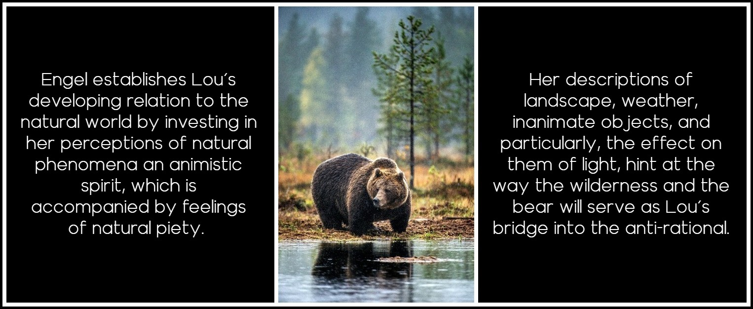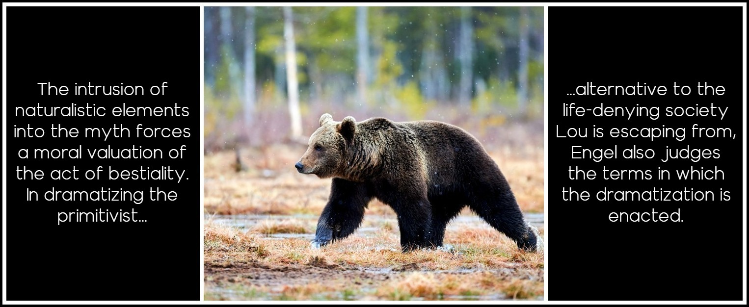 Engel wants to make it very clear that the problems of contemporary civilization are immeasurably more complex than those of any purely mythic wilderness. She refuses Wordsworth-style pristine epiphanies in the head: these moments of communion are orgasmic too. The intrusion of naturalistic elements into the myth forces a moral valuation of the act of bestiality. In dramatizing the primitivist alternative to the life-denying society Lou is escaping from, Engel also judges the terms in which the dramatization is enacted. Lou’s eventual failure to observe the integrity of the bear’s fundamental otherness represents something far more serious than a mere breach of decorum or rejection of gentility. Bestiality is a taboo, not a hypocritical Puritan admonition on the order of strictures against premarital sex. As a taboo object, the bear is ‘holy’ in the sense that he brings Lou into communion with a state of innocence through her own partly instinctive, partly learned rapprochement with nature.