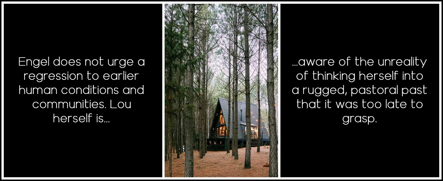 Engel relies primarily on the primitivist motif to articulate her linking themes and to structure their narrative interplay in the remainder of the novel. She uses primitivism in the post-modern, conscious manner: the myth functions as a structural principle by which the concept of rites of passage organizes the narrative and determines her handling of time; as a source of metaphor which places the action in a discrete cultural and anthropological perspective; and as a stylistic resource upon which to draw for such characteristic elements as animism, natural piety, and ritual to enrich the language of her telling. Bear is not in the ‘naive’ primitivist tradition of earlier conventions of the Golden Age, the pastoral, or the Noble Savage. Engel does not urge a regression to earlier human conditions and communities; Lou herself is aware of the unreality of thinking herself into a rugged, pastoral past that it was too late to grasp.