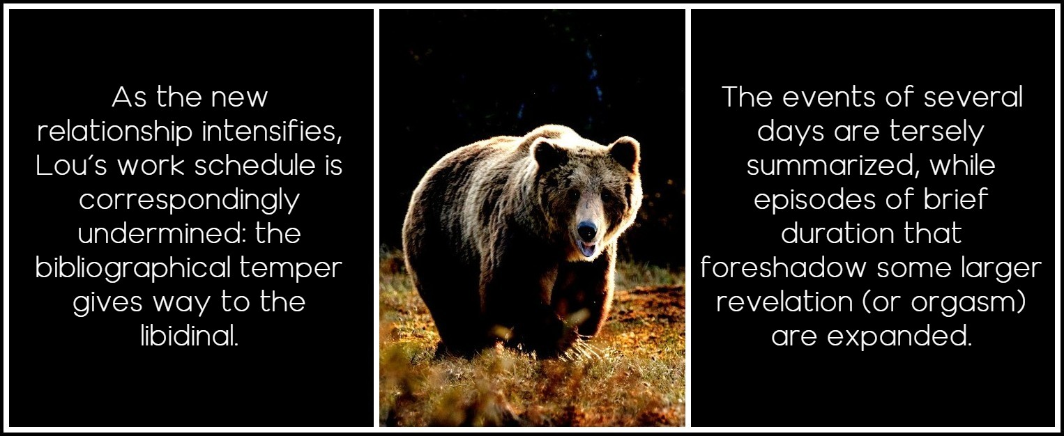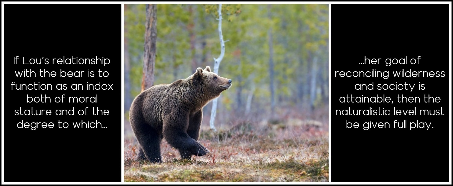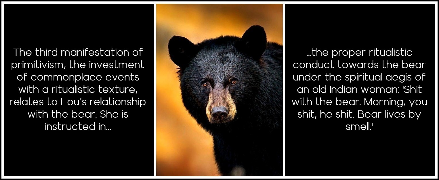 The third manifestation of primitivism [after animism and natural piety], the investment of commonplace events with a ritualistic texture, relates to Lou’s relationship with the bear. In primitive mythology, the bear lends itself to totemic uses; these are repeatedly alluded to in the series of notes about bears Lou discovers in Cary’s books. Primitive man appealed to the animistic powers present in the totem through propitiatory observances. Lou is instructed in the proper ritualistic conduct towards the bear in an earthy, pragmatic manner under the spiritual aegis of his former keeper, an old Indian woman, who advises her: Shit with the bear. Morning, you shit, he shit. Bear lives by smell.