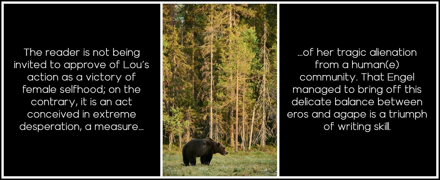 She fails, then, to observe moral propriety on the deepest level; her exercise of sexual domination betrays this reverential bond by shifting the natural order of the relationship in favour of her own emotional and sexual imperatives. She attempts to force on the bear the selfsame rape of selfhood previously inflicted on her by men—and she knows it: The next day she was restless, guilty. She had broken a taboo. She had changed something. The quality of her love was different now. She had gone too far with him. There was something aggressive in her that always went too far. She felt empty and angry, a woman who stank of bestiality. The novelist, fully capable of distinguishing between life and death, holds the moral evaluation in a tight ironic perspective. The reader is not being invited to approve of Lou’s action as a victory of female selfhood; on the contrary, it is an act conceived in extreme desperation, a measure of her tragic alienation from a human(e) community. That Engel managed to bring off this delicate balance between eros and agape is a triumph of writing skill.