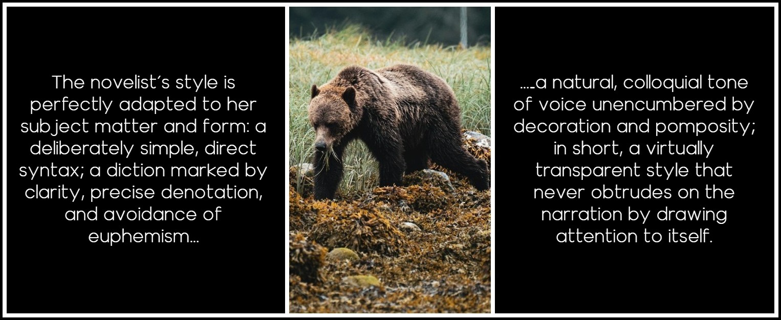 One final issue, concerned with style, rises from the critics’ debate about Bear. Even most of its detractors praised the ‘lyrically simple,’ ‘strong, spare’ style. Scott Symons, however, interprets the ‘stiltedness’ of style as symptomatic of the novel’s overall ruinous ‘pretentiousness’: This ‘extrinsicness’ of decor and detail is more than just minor. It invades the entire prose style, as a predicate of being (or of non-being!). Because when Ms. Engel’s prose leaves the ‘See John run. See Mary run.’ category (Ontario Methodist school primer literacy), of which ‘Bear. There. Staring’ is only a small example, then it becomes a kind of concerted poeticness, a few considered lines of nature-poesy. These are often quite attractive in themselves, but paste-ons so far as the book is concerned as a whole. Apart from indulging in the obvious rhetorical ploy of ‘proving’ his accusation by adducing as textual evidence a three-word extract, Symons betrays his insensitivity to the novelist’s selection of a style perfectly adapted to her subject matter and form: a deliberately simple, direct syntax; a diction marked by clarity, precise denotation, and avoidance of euphemism; a natural, colloquial tone of voice unencumbered by decoration and pomposity; in short, a virtually ‘transparent’ style that never obtrudes on the narration by drawing attention to itself. Taken in isolation, Engel’s effects run the risk of sounding as lifelessly prosaic as ‘primer style’ because their imaginative force is cumulative.