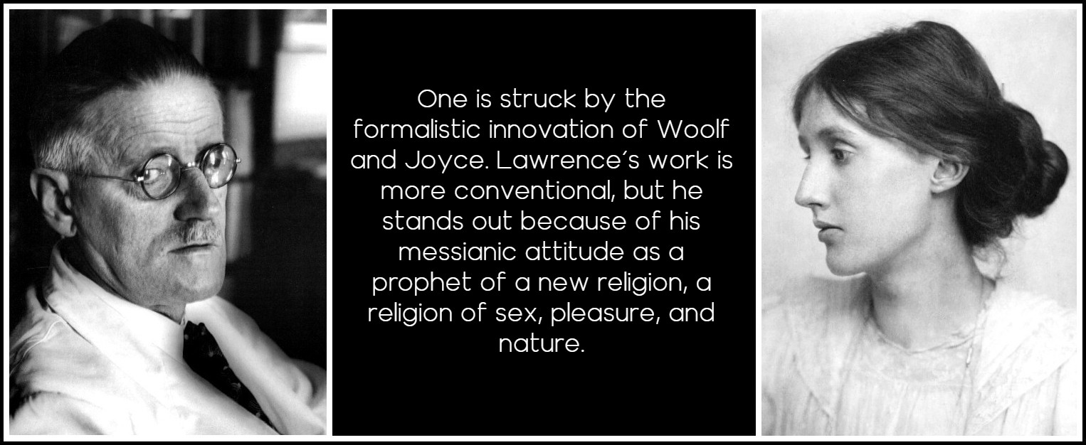 Lawrence’s work is very unequal. He wrote some disastrous things, like The Plumed Serpent and Kangaroo, while everything that Woolf wrote, for instance, is interesting. And Joyce was nothing less than a genius. So, I would have to say that Lawrence is less important. Also, while one is struck by the formalistic innovation of Woolf and Joyce, Lawrence’s work, as I’ve said, is more conventional. But Lawrence stands out because of his messianic attitude as a prophet of a new religion, a religion of sex, pleasure, and nature.