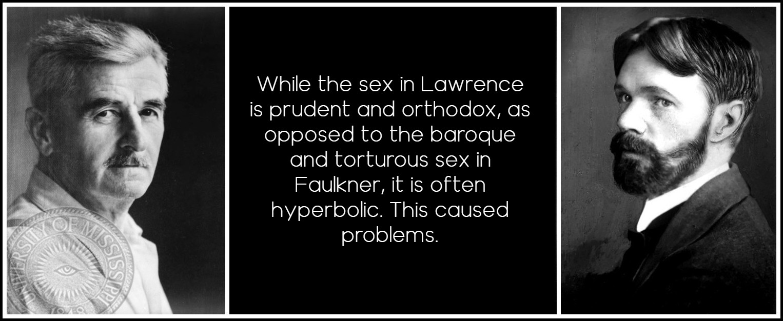The line between these limits is fine; it is a formal matter. If the structure of a work treats these matters with sensibility and a formal acumen, then that work transcends pornography. While the sex in Lawrence is prudent and orthodox, as opposed to the baroque and torturous sex in Faulkner, it is often hyperbolic. This caused problems. But it was not gratuitous sex: it was expressed very beautifully, with a stylistic excellence not found in pornography.