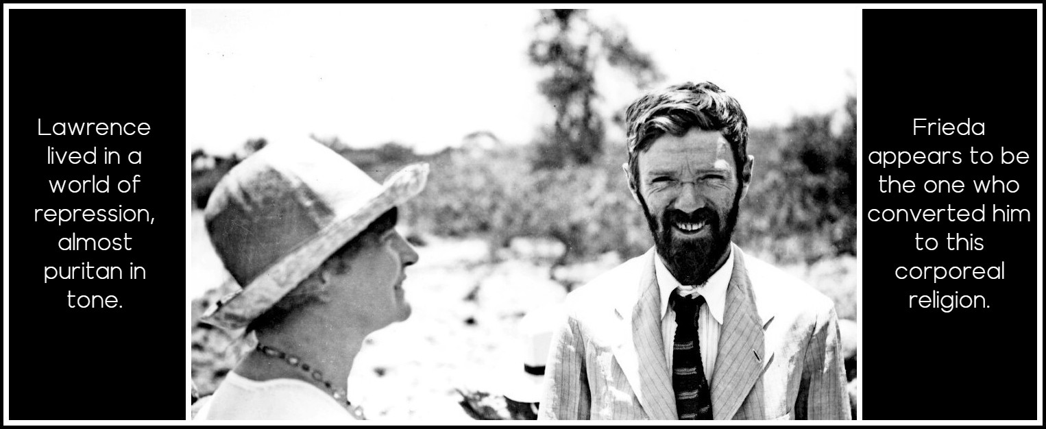 Lawrence lived in a world of repression, almost puritan in tone. And Lawrence, in some sense, expressed the religion of the body, a revolutionary and courageous stance to take in his time. Frieda, his second wife, appears to be the one who converted Lawrence to this corporeal religion.