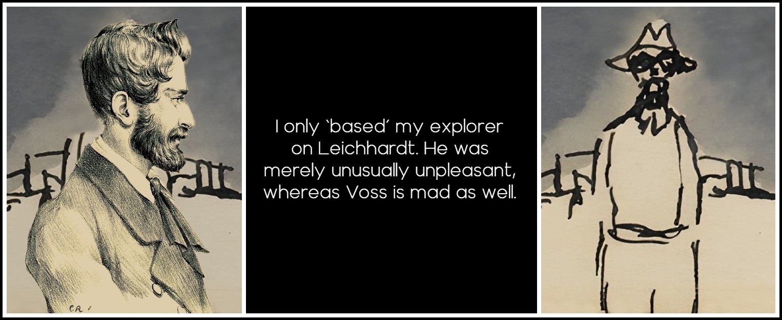The essence of Voss was White himself: Bits of Leichhardt, bits of John Eyre [an explorer whose journal ‘electrified’ White], and I suppose, some of the others, but there is more of my own character than anybody else’s. He gave Voss the ‘gabled town’ of Hanover as his birthplace, and his first explorations were conducted on the sandy heath that surrounds the city White knew best in Germany.