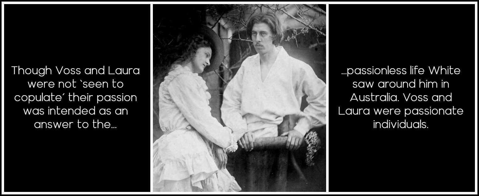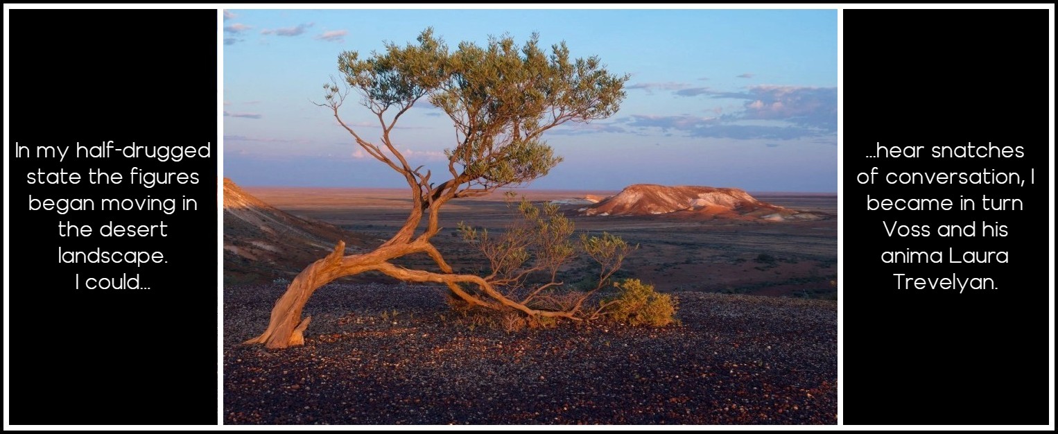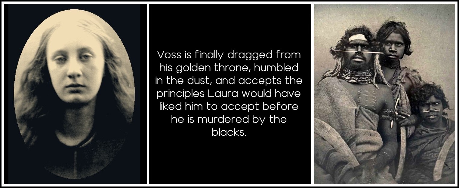 I also wanted to write the story of a grand passion. So this is at the same time the story of a girl called Laura Trevelyan, the niece of a Sydney merchant, one of the patrons of Voss’s expedition. It is different from other grand passions in that it grows in the minds of the two people concerned more through the stimulus of their surroundings and through almost irrelevant incidents. Voss and Laura only meet three or four times before the expedition sets out. They even find each other partly antipathetic. Yet, Voss writes proposing to the girl on one of the early stages of the journey, partly out of vanity, and partly because he realizes he is already lost. She accepts, partly out of a desire to save him from his delusions of divinity; partly out of a longing for religious faith, to which she feels she can only return to through love. As the two characters are separated by events and distances, their stories have to be developed alternately, but they do also fuse, in dreams, in memories, and in delirium – most closely, for instance, when Voss is lying half-dead of thirst and starvation, and Laura is suffering from delusions as the result of a psychic disturbance diagnosed as the inevitable ‘brain fever’. Voss is finally dragged from his golden throne, humbled in the dust, and accepts the principles Laura would have liked him to accept before he is murdered by the blacks. Laura recovers. She becomes a headmistress, and figure of some respect in the community, if also one that nobody really understands, because of some mysterious past.