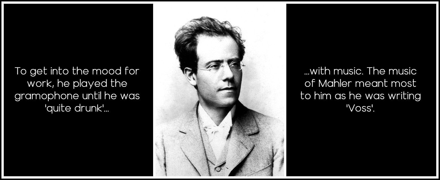 White was conscious of being influenced more by music and painting than writing. In the last ten years I think music has taught me a lot about writing, he told Ben Huebsch. That may sound pretentious, and I would not know how to go into it rationally, but I feel that listening constantly to music helps one to develop a book more logically. To get into the mood for work, he played the gramophone until he was ‘quite drunk’ with music. Always something of a frustrated painter, and a composer manqué, I wanted to give my book the textures of music, the sensuousness of paint, to convey through the theme and characters of Voss what Delacroix and Blake might have seen, what Mahler and Liszt might have heard. The music of Mahler meant most to him as he was writing Voss.