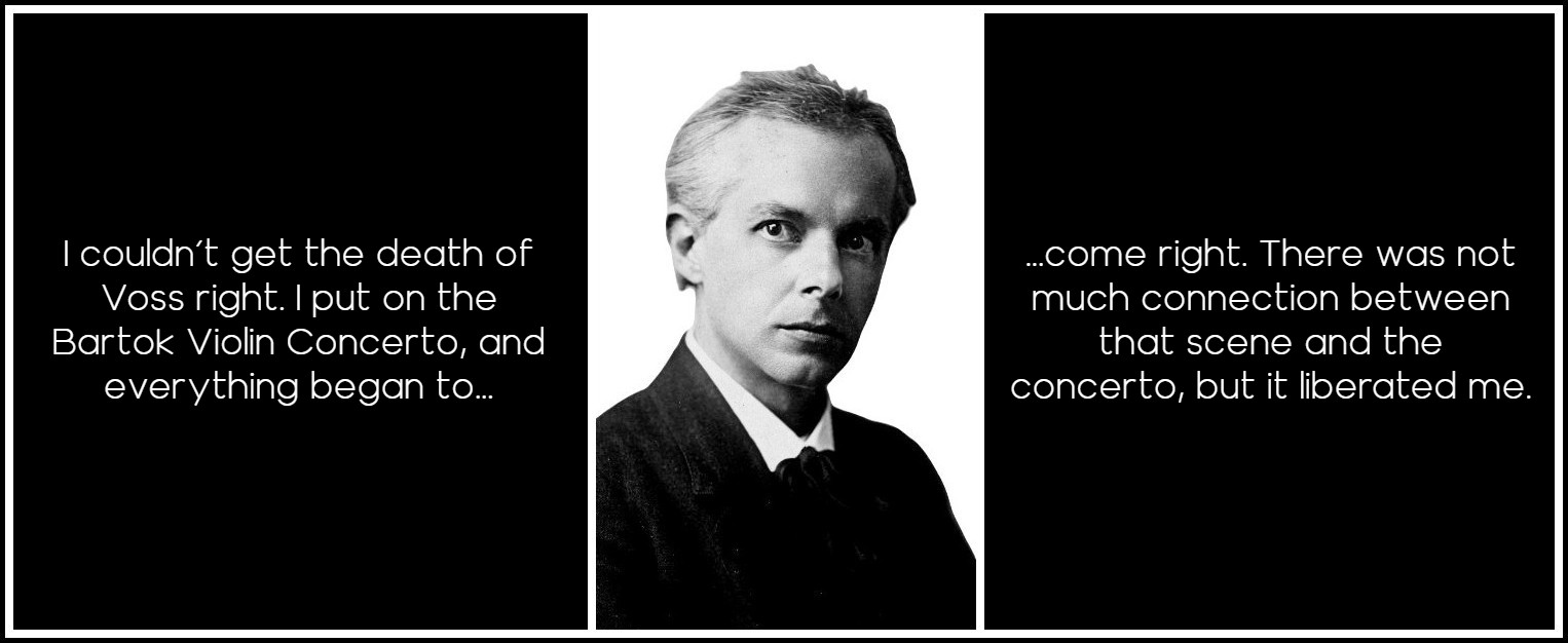 It took Bartok to finish off the explorer. I couldn’t get the death of Voss right, and I was in bed with bronchitis feeling like death. I suddenly got out and put on the Bartok Violin Concerto, and everything began to come right. I suppose there was not much connection between that scene and the concerto, but it liberated me.