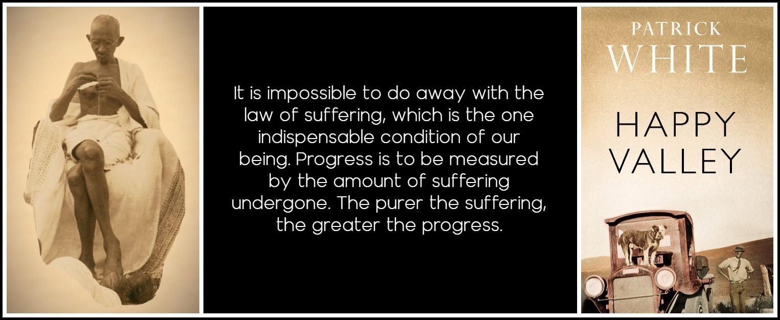 Suffering is a theme that runs through all White’s work, but Voss is, more than any of his other novels, an account of its virtues. Mahatma Gandhi wrote: It is impossible to do away with the law of suffering, which is the one indispensable condition of our being. Progress is to be measured by the amount of suffering undergone. The purer the suffering, the greater the progress. White had used those words as an epigraph for Happy Valley. Twenty years later they could have served as well for Voss.