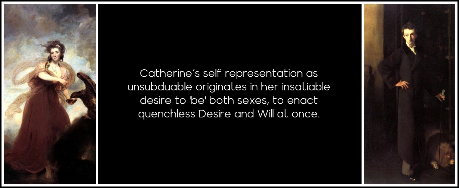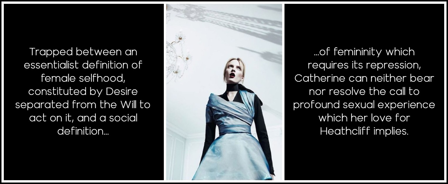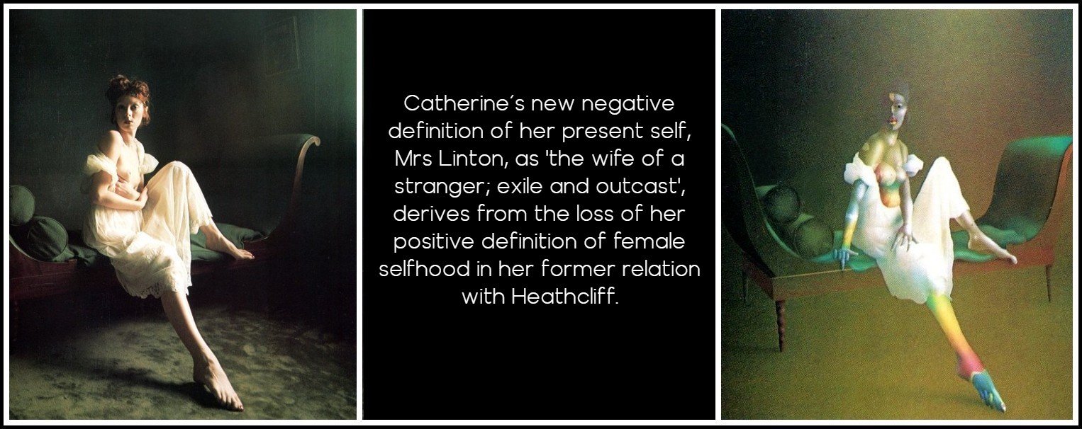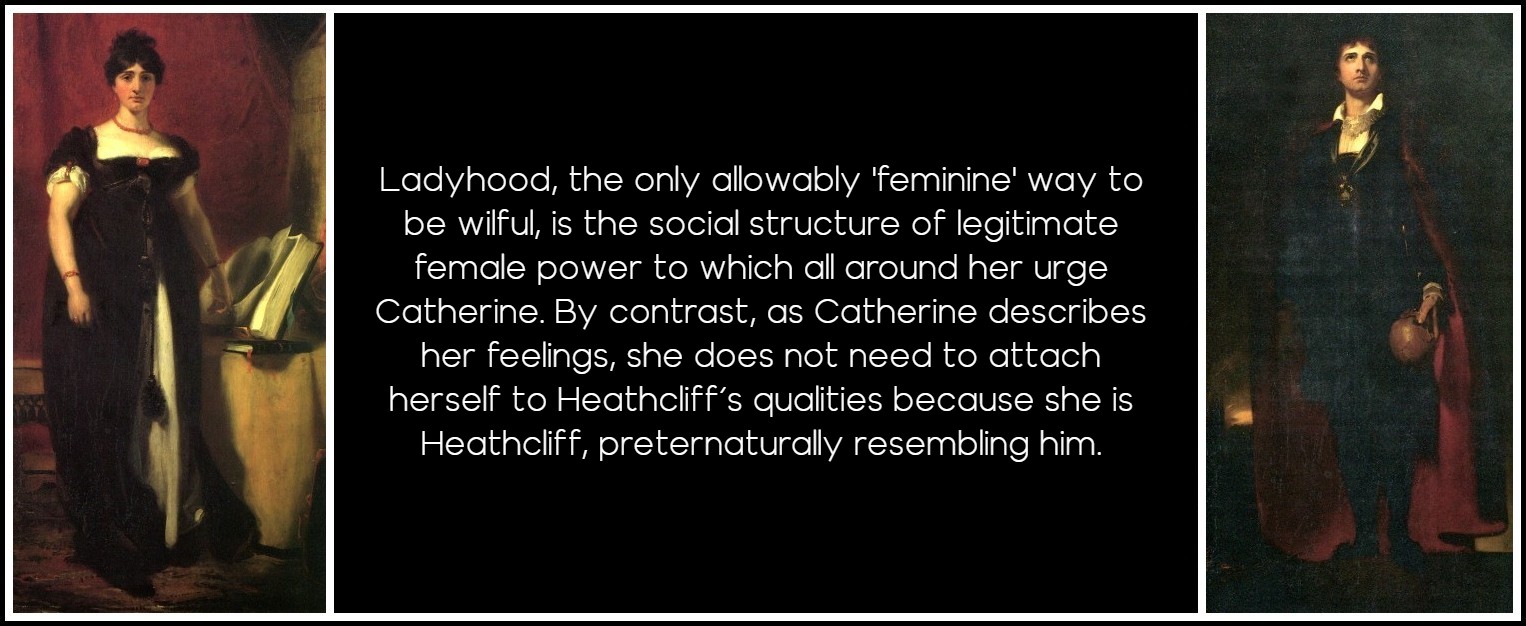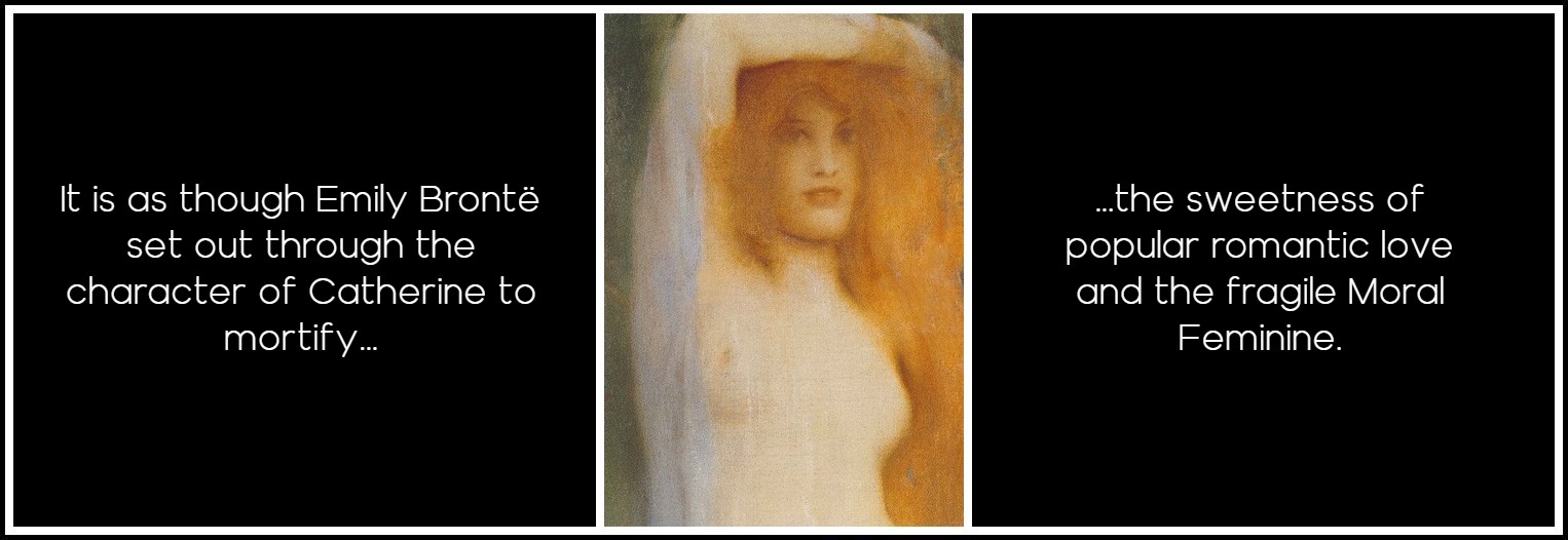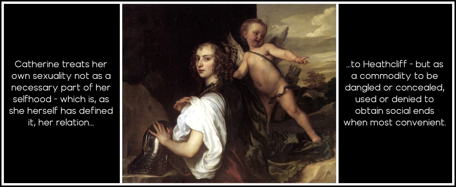 Her proposal is that they will inhabit the physical world together, necessarily connected in all ways but the sexual, just as they shared one bed as innocent children. Catherine thus treats her own sexuality not as a necessary part of her selfhood—which is, as she herself has defined it, her relation to Heathcliff—but as a commodity to be dangled or concealed, used or denied to obtain social ends when most convenient. Moreover, Catherine believes that this denial of the sexual aspect of her love for Heathcliff is justified by that sympathy which she is able to feel for him alone. In her own view, Cathy sees herself as the Lady who will ‘aid Heathcliff to rise’ both materially and from his ignorant brutality, with her husband’s money and status. The pose that Catherine would assume is, in fact, based on the sentiment of Moral Femininity: that by withholding or denying her sexuality, the woman-as-angel can influence the recalcitrant male and ‘help’ him to rise above his own brutality.