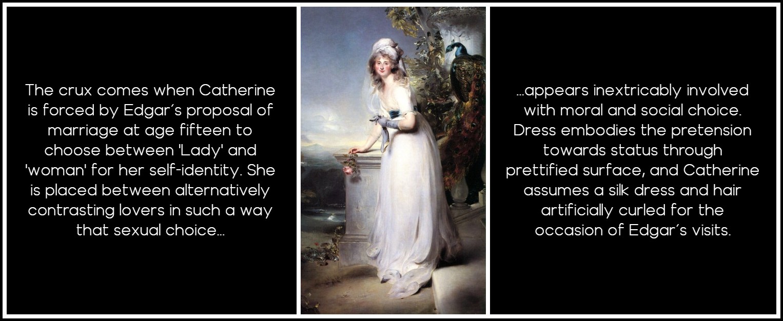Catherine had already begun to fail in her early bid for our sympathy when she entered the competitive-exploitative world of ladies and gentlemen at age twelve. The crux comes, of course, when she is forced by Edgar’s proposal of marriage at age fifteen to choose between ‘Lady’ and ‘woman’ for her self-identity. Like Jane Eyre, Cathy is placed between alternatively contrasting lovers in such a way that sexual choice appears inextricably involved with moral and social choice. Nelly, for one, however, is quite clear on this point: her motive is that she is ‘full of ambition’, not merely for wealth and social status, but also—perhaps more—for the admiration and devotion of Edgar and Isabella. These are, in Nelly’s significant choice of words, ‘acquisitions that flattered her from the first’. Dress embodies the pretension towards status through prettified surface, and Catherine assumes a ‘silk dress’ and hair artificially curled for the occasion of Edgar’s visits. Similarly, the a priori ‘we-ness’ that formerly made her companionship with Heathcliff egalitarian and unselfconscious is replaced by her irritated sense that Heathcliff has little social conversation. ‘You might be dumb or a baby for anything you say to amuse me, or for anything you do, either!’ she accuses him, thereby betraying the mode of unearned consumption of leisure and goods which is the hallmark of the Lady.