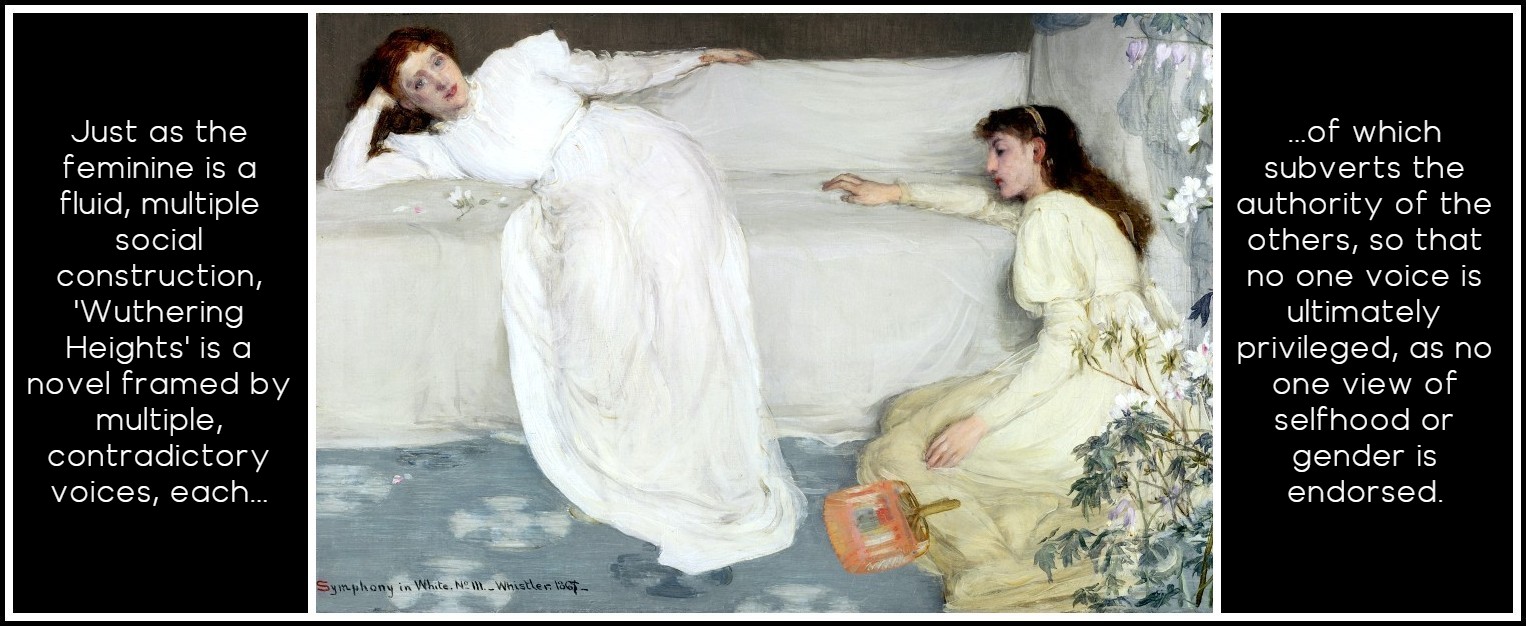Perhaps one might justly say of all the Brontë sisters’ heroines that they are ‘quenchless’ in the sense of Emily Brontë’s verse above, but Wuthering Heights is unique even among Brontë novels as a construction of identity as a craving will which is both insatiable and unsubduable. As if they were a gloss on Wuthering Heights, the wonderful lines by Emily Brontë above seem to propose a Brontëan concept of self: if no Heaven could fulfil the insatiable desire of the poem’s persona, neither could Hell quench the unsubduable will. Both Desire and the Will to act on Desire are seen here as ‘quenchless’, too strong to be either completed or repressed. The alliance of these two, whose strength is the hallmark of individual identity, forms an essentialist view of selfhood, in which a ‘real’ self, a more genuine inner core, is felt to lie buried beneath a distorting layer of social behaviour, values and roles. It would seem, in the social/historical context of Victorian England, that the unfulfilled lack in which Desire originates might easily be associated with the conventional notions of the feminine, and the self-determining practices of an indomitable Will viewed as correspondingly masculine, but this poem unites the two in one selfhood unmarked by gender. But Wuthering Heights is not unmarked by gender; its sexual story is the context for the disclosure of a crisis of female selfhood. Sexuality itself is constituted in the textual body of its two heroines, Catherine Earnshaw and her daughter, Catherine Linton. But just as the feminine is a fluid, multiple social construction, Wuthering Heights is a novel framed by multiple, contradictory voices, each of which subverts the authority of the others, so that no one voice is ultimately privileged, as no one view of selfhood or gender is endorsed.