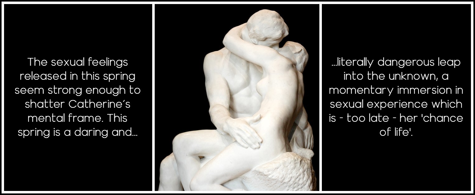 In the delirium of her mad episode, Catherine showed her knowledge that Heathcliff would ‘rather I’d come to him’, i.e. embody their ‘we-ness’ in the leap to a human sexual relation, rather than in death, the way through the kirkyard. Now, as tension between them mounts to fearful climax, ‘An instant they held asunder; and then how they met I hardly saw, but Catherine made a spring, and he caught her, and they were locked in an embrace from which I thought my mistress would never be released alive.’ The sexual feelings released in this spring seem strong enough to shatter Catherine’s mental frame: ‘To my eyes,’ says Nelly, ‘she seemed directly insensible’. This ‘spring’ is the inverse of that ‘spring from the window’ with which Catherine had threatened Edgar if he mentioned Heathcliff’s name; it is not an attempt to bridge over ‘the abyss where I grovelled’, Catherine’s consciousness of the empty universe and the vacancy of her selfhood, by an avoidance of irresolvable conflict. It is a daring—and literally dangerous—leap into the unknown, a momentary immersion in sexual experience which is, too late, her ‘chance of life’.
